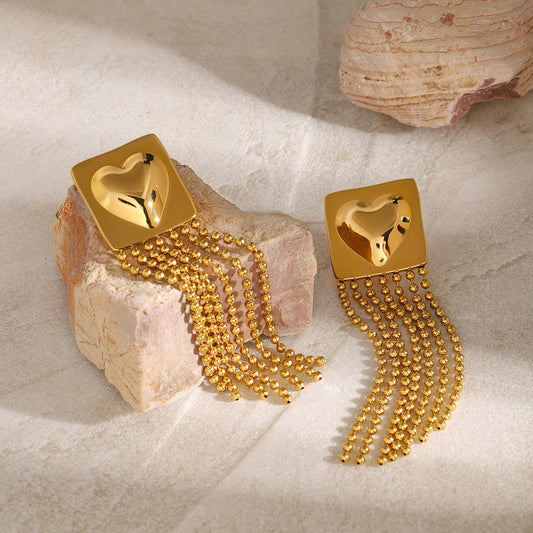 18K gold trendy individual square earrings with heart and round bead tassel design