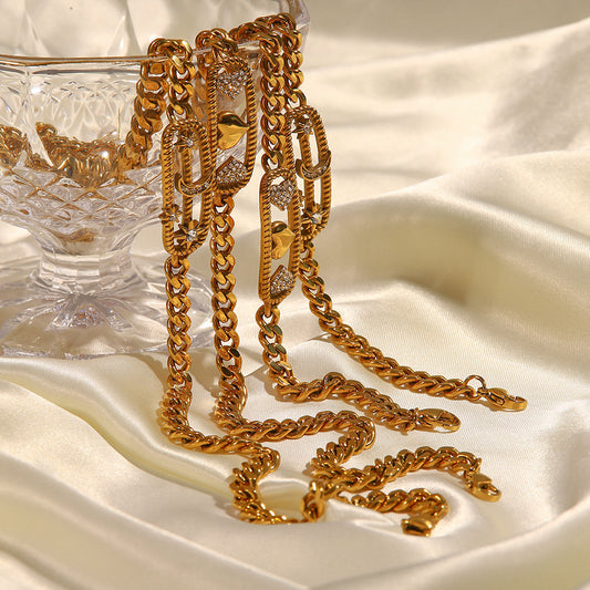 18K Gold Simple Retro Diamond Heart/Star Design Punk Bracelet Necklace Set