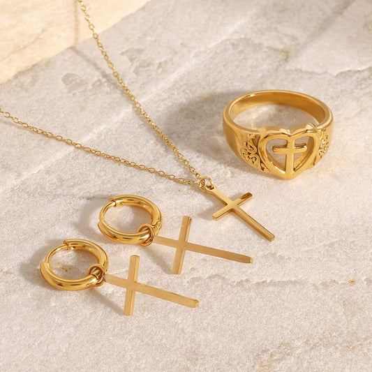 18K Gold Cross Design Luxury Ring, Necklace and Earring Set