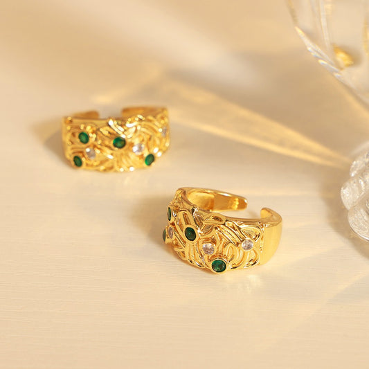 18K gold fashionable retro irregular carving with zircon design open ring