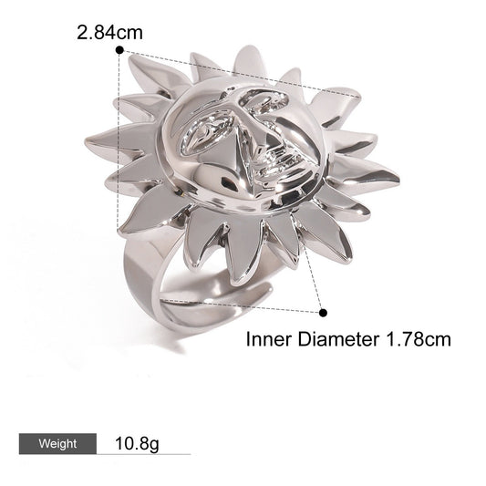 18K gold sun-shaped ring with human face texture design