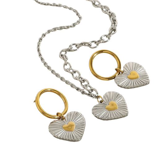 18K gold heart with gold and silver color matching design exquisite and fashionable necklace and earrings set