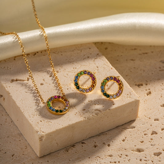 18k Gold Noble and Exquisitely Inlaid Colorful Zircon Circle Design Light Luxury Wind Earrings Necklace Set