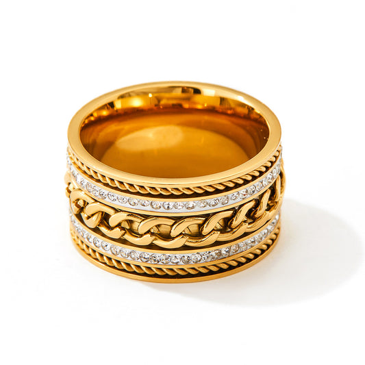18K gold trendy and personalized wide-faced double-row diamond-set ring with twist chain design
