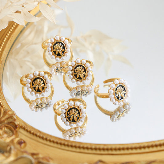 18K gold exquisite noble flower and pearl design light luxury style ring