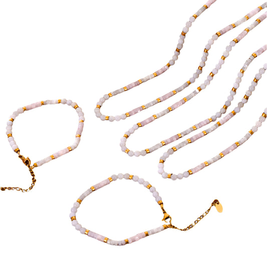 18K gold noble and elegant small cylinder with gemstone beaded design bracelet and necklace set