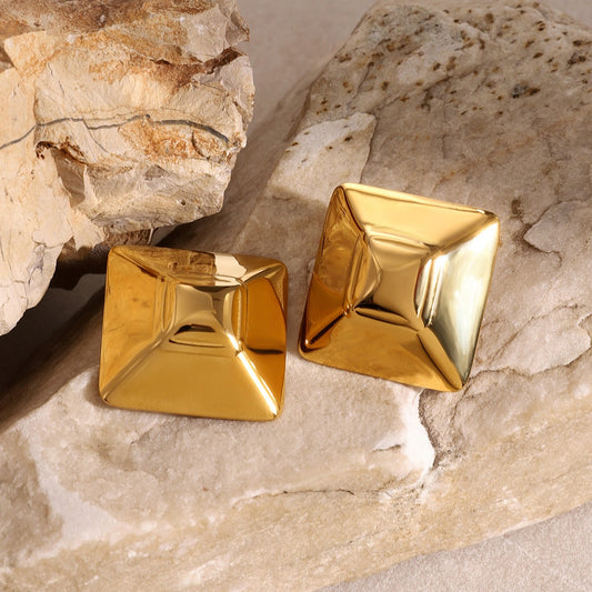 18K gold simple and elegant square with tower-shaped convex design earrings