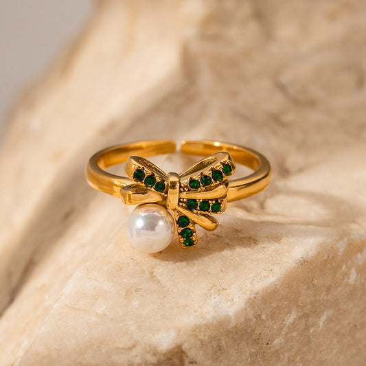 18k Gold Exquisite Noble Bow Knot Inlaid Green Diamond Matching Pearl Opening Design Versatile Ring
