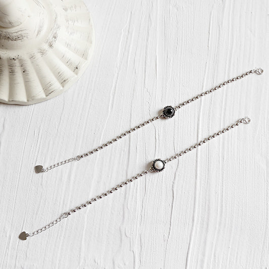 Holiday Round Shell Pearl/Black Agate 925 Sterling Silver Beads Bracelet