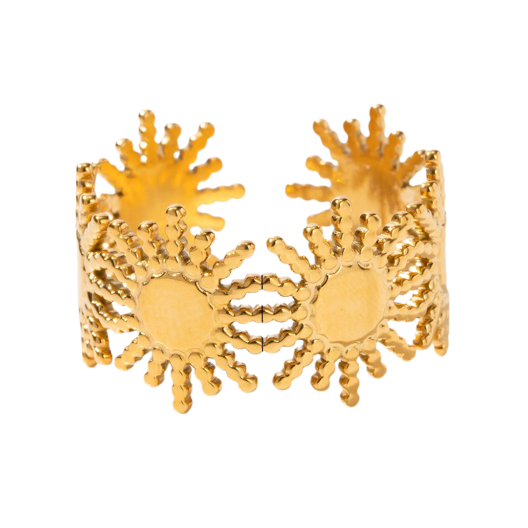 This 18K Gold Sun-Shaped Gemstone-Inlaid Luxury Ring masterfully blends elegance with contemporary design. Crafted from durable stainless steel with lasting 18K PVD gold plating, it resists fading and scratches while remaining hypoallergenic and waterproof. The sun-inspired motif radiates warmth through finely detailed textures or sparkling gemstone inlays, each enhancing the ring’s natural beauty and sophistication. Lightweight yet striking, this piece highlights your refined taste and individuality, making it a timeless accent for any ensemble. Its meticulous craftsmanship ensures it will remain a cherished symbol of vitality and style for years to come