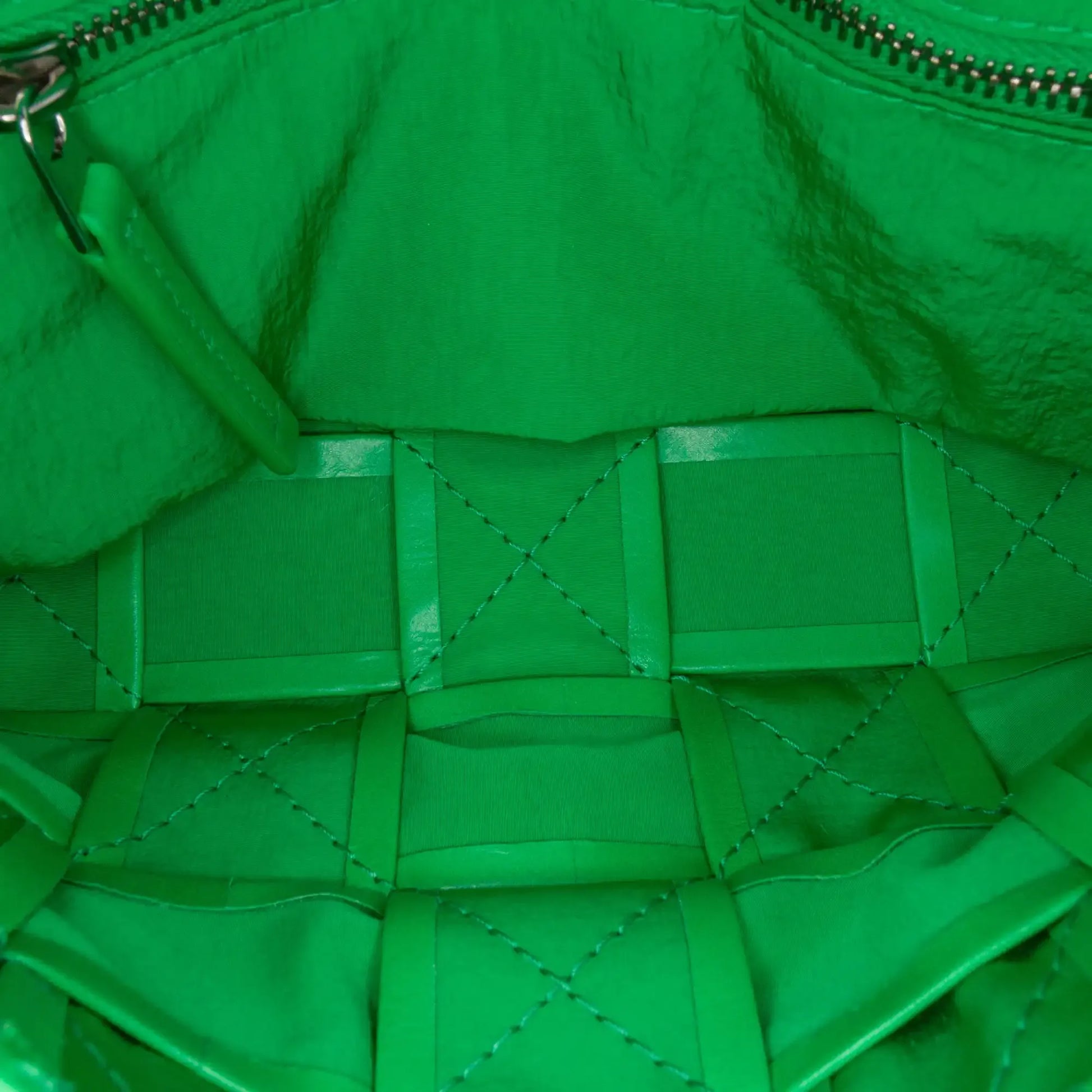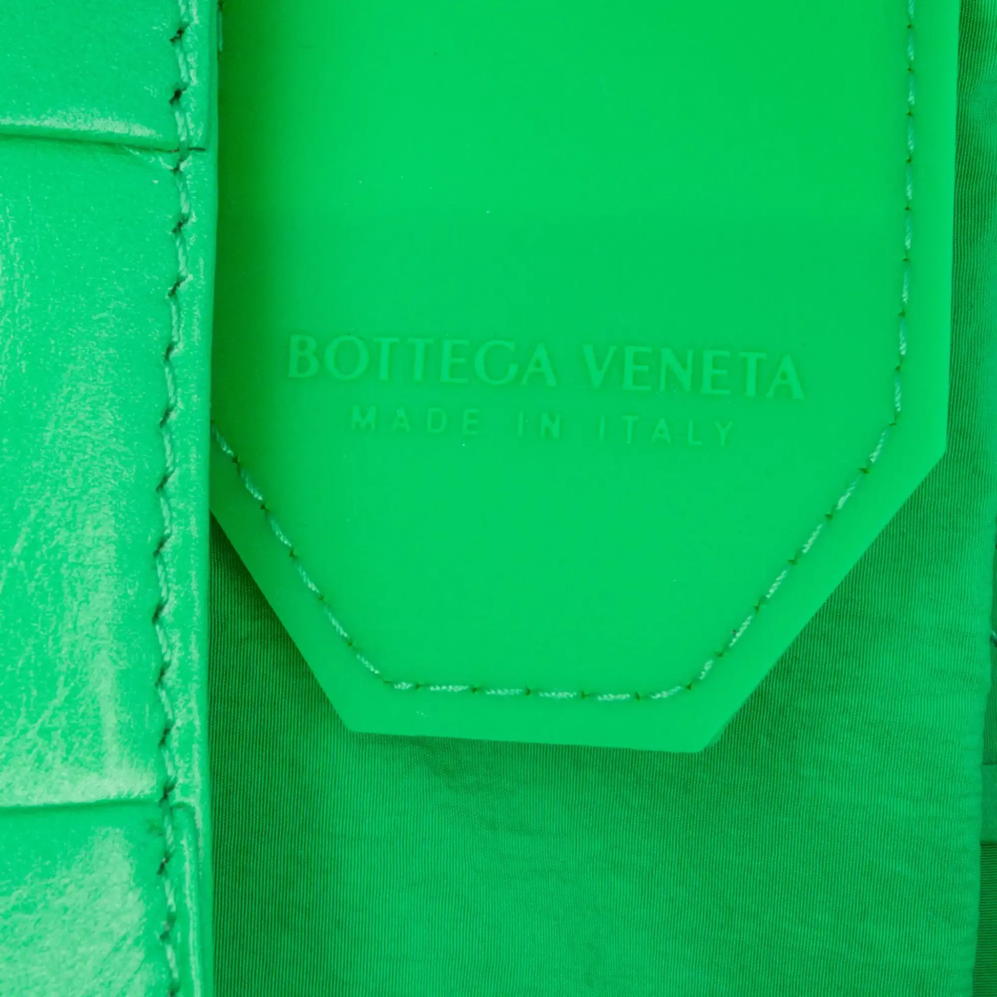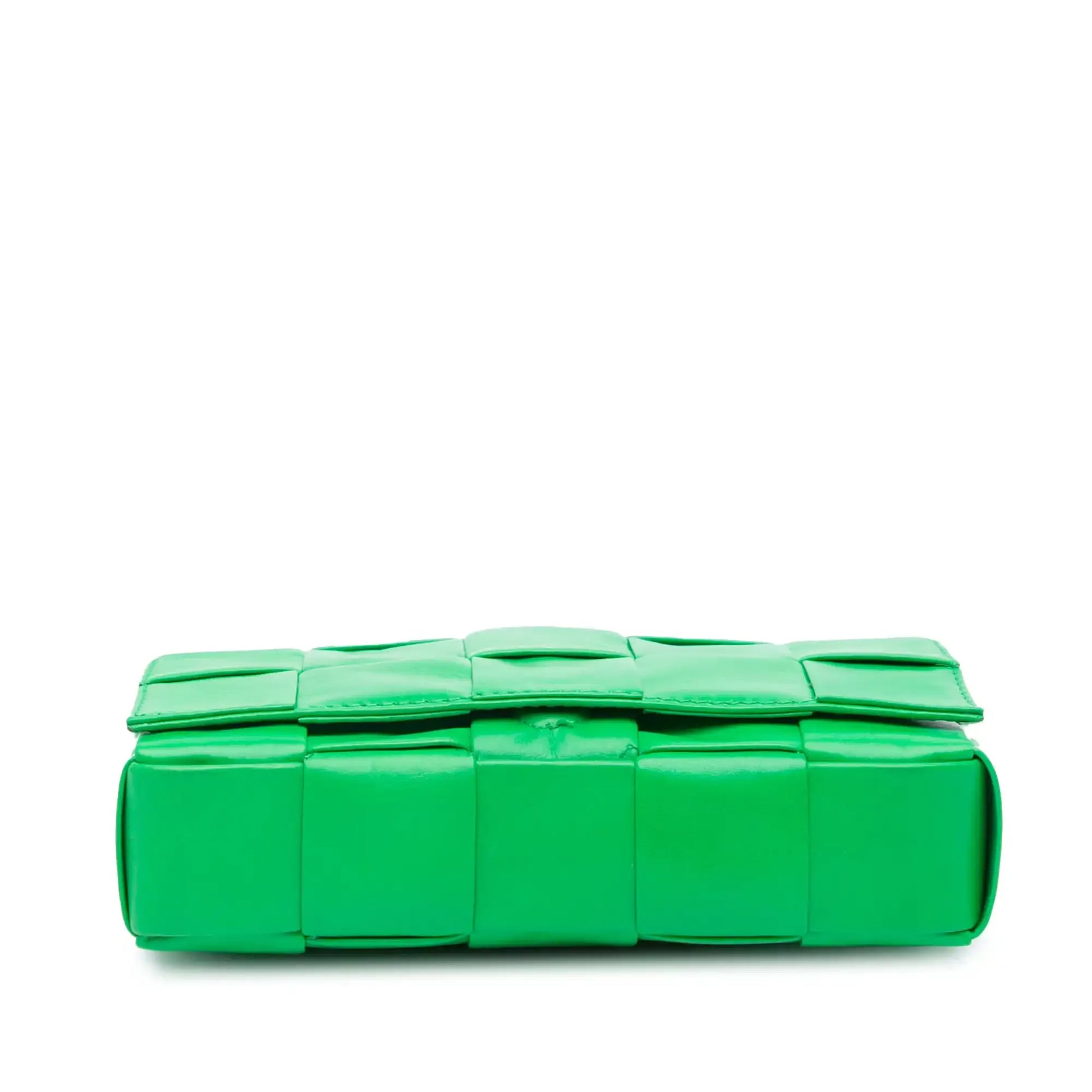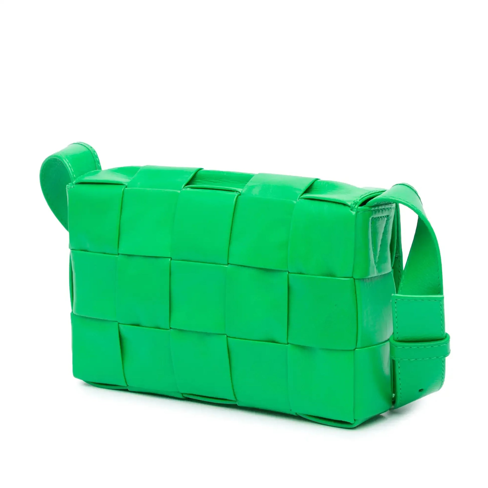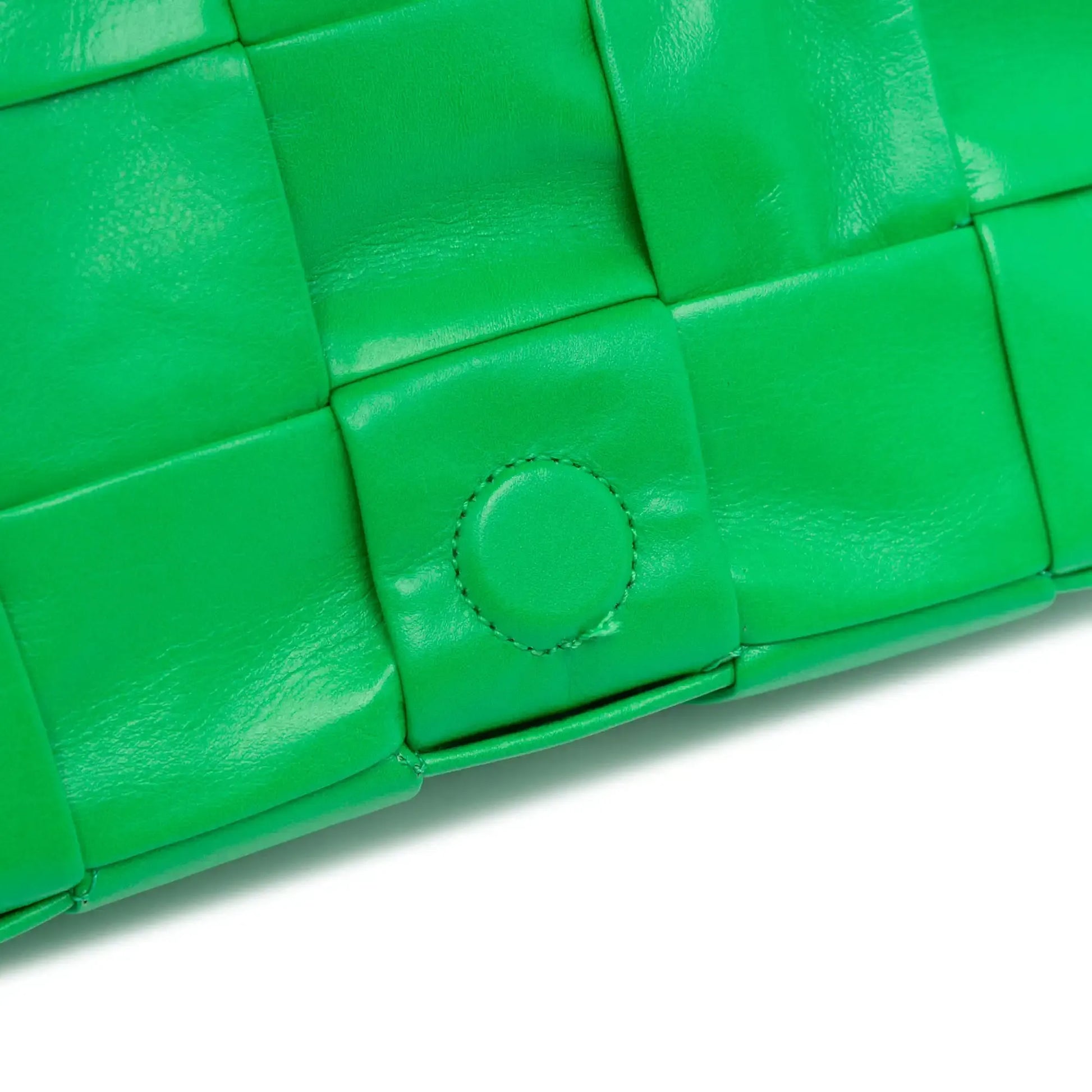 | Description | The Cassette features a woven nappa leather body, a flat leather shoulder strap, a front flap closure, and an interior zip pocket. | ||||||||||||