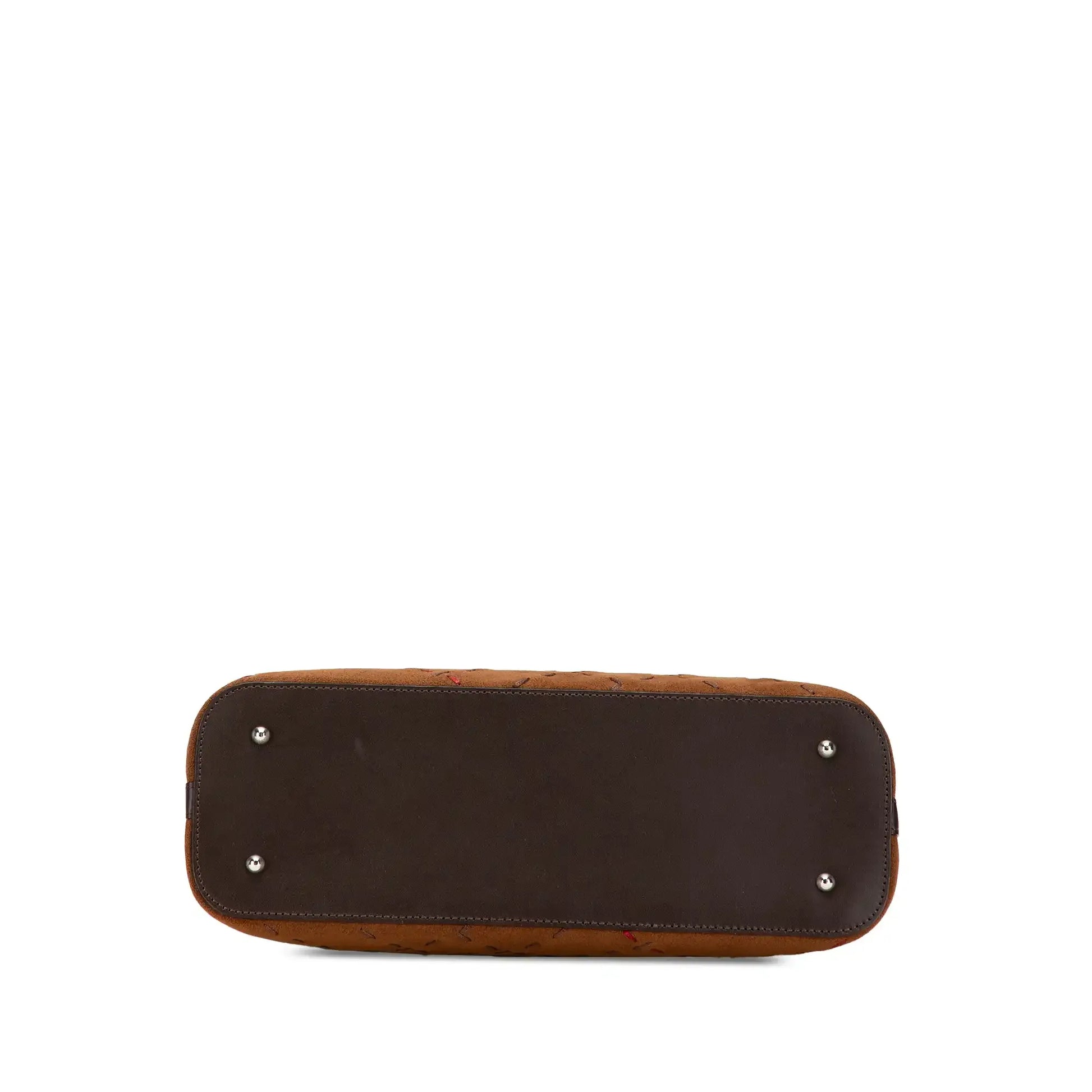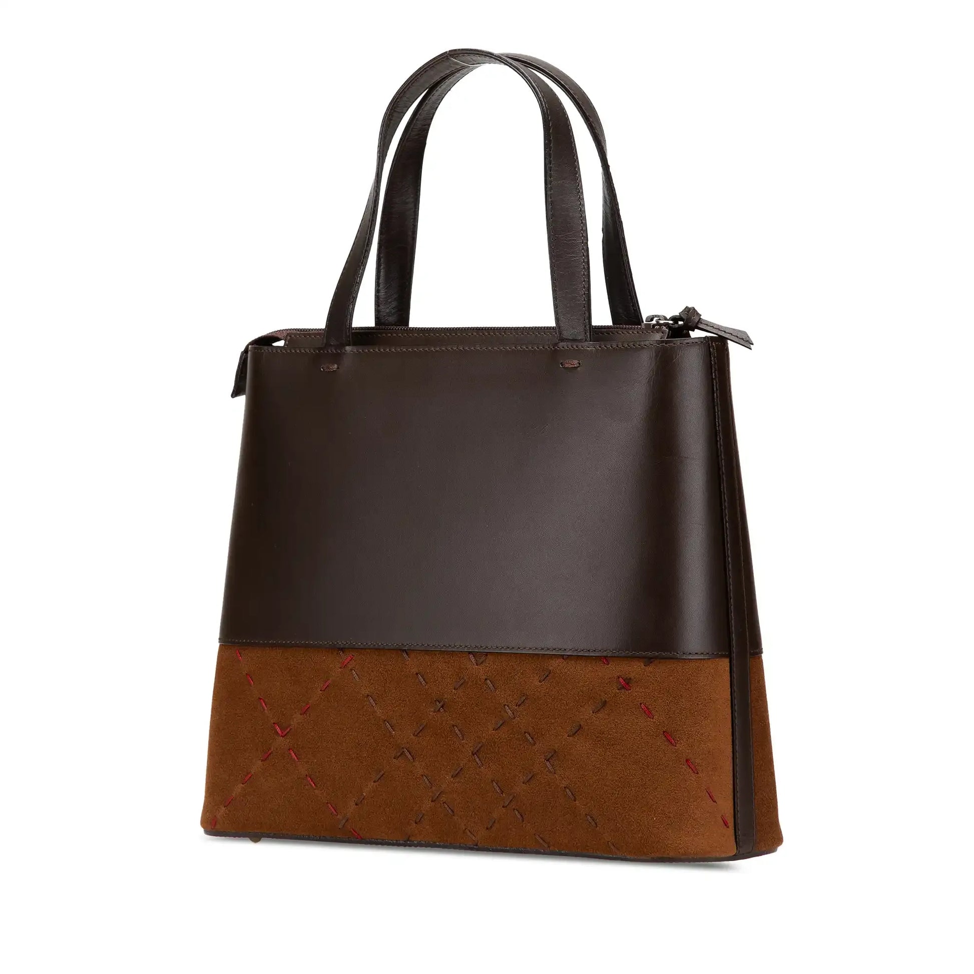 Description | This handbag features leather and suede body, flat leather straps, a top zip closure, and interior zip and slip pockets. | ||||||||||||