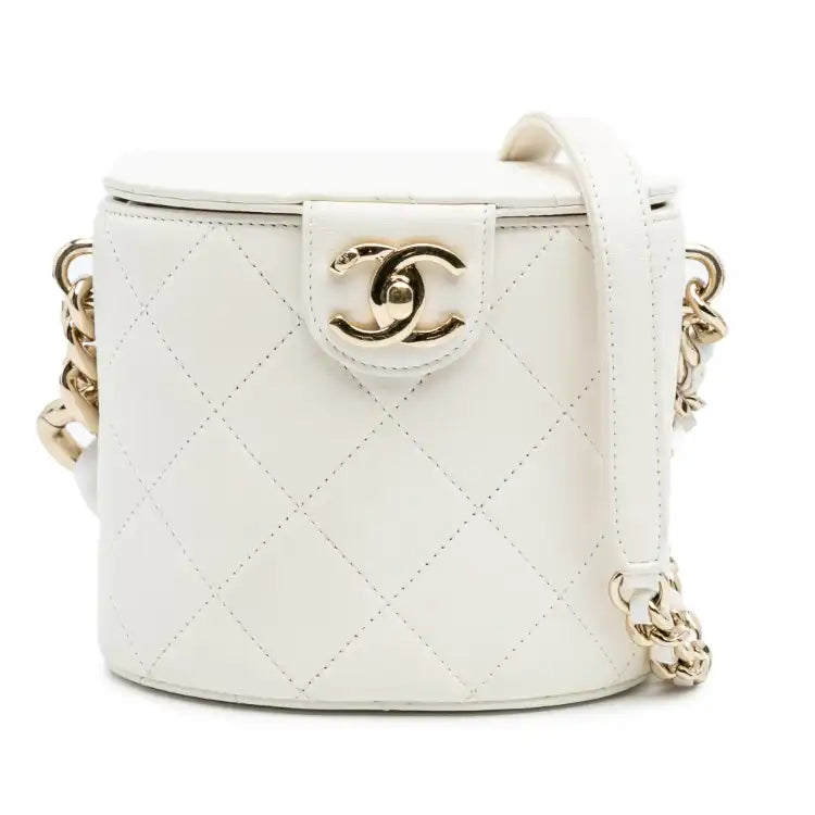 Description | This vanity bag features a quilted lambskin leather body, a chain-link and leather woven chain shoulder strap with resin details, a top flap with CC turn-lock closure, and interior slip pockets. | ||||||||||||