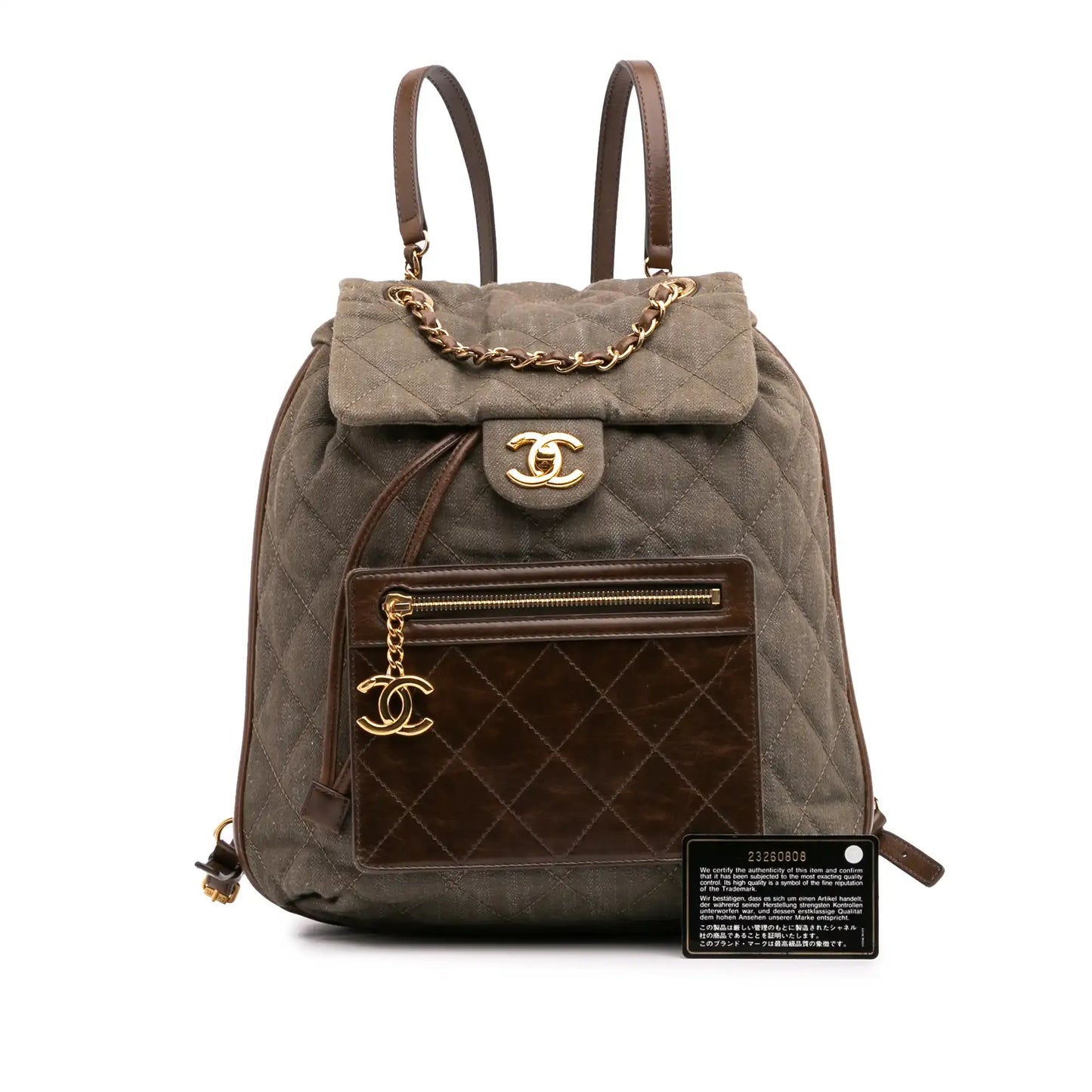 Description | This backpack features a quilted denim body, flat leather back straps, a top flap with twist lock closure, a top with drawstring closure, a front exterior zip pocket, and an interior slip pocket. | ||||||||||||