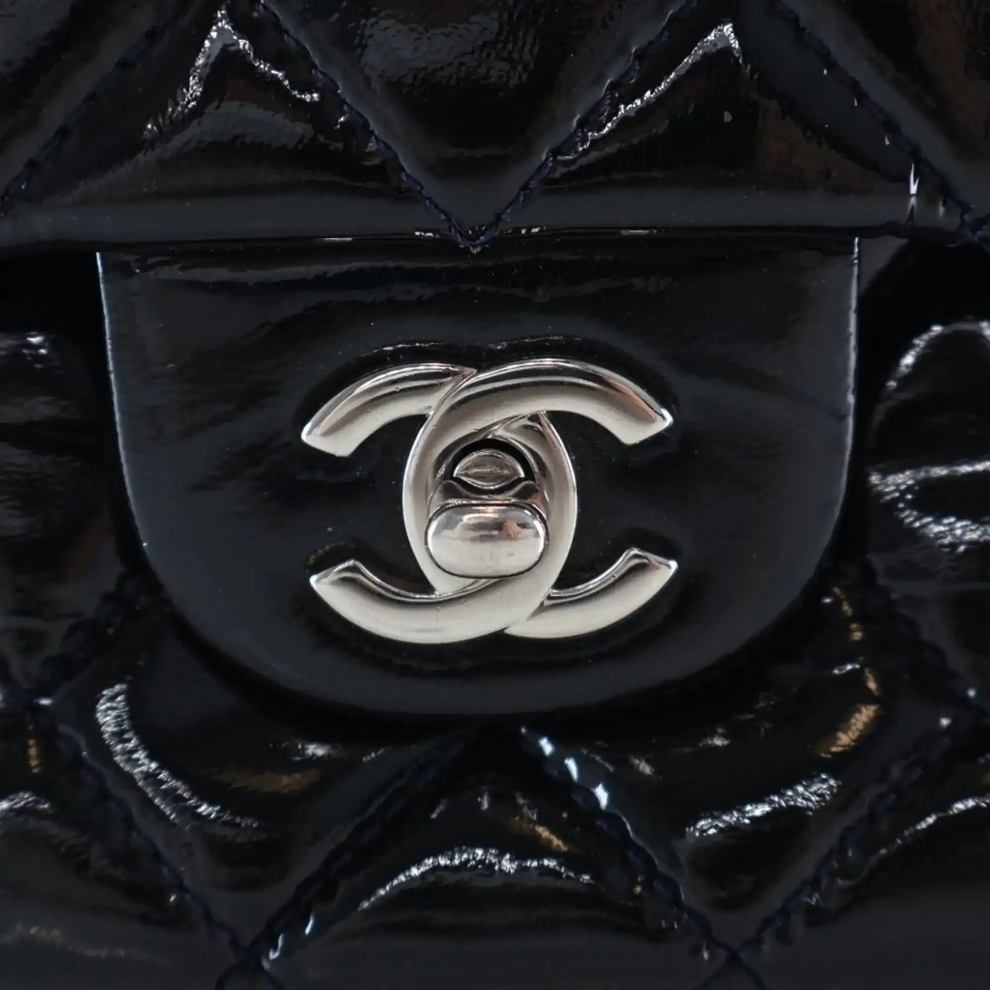 Description | This shoulder bag features a quilted patent leather body, silver-tone leather woven chain link straps, a front flap with CC turn lock closure, an exterior back slip pocket, three interior open compartments, and interior zip and slip pockets. | ||||||||||||