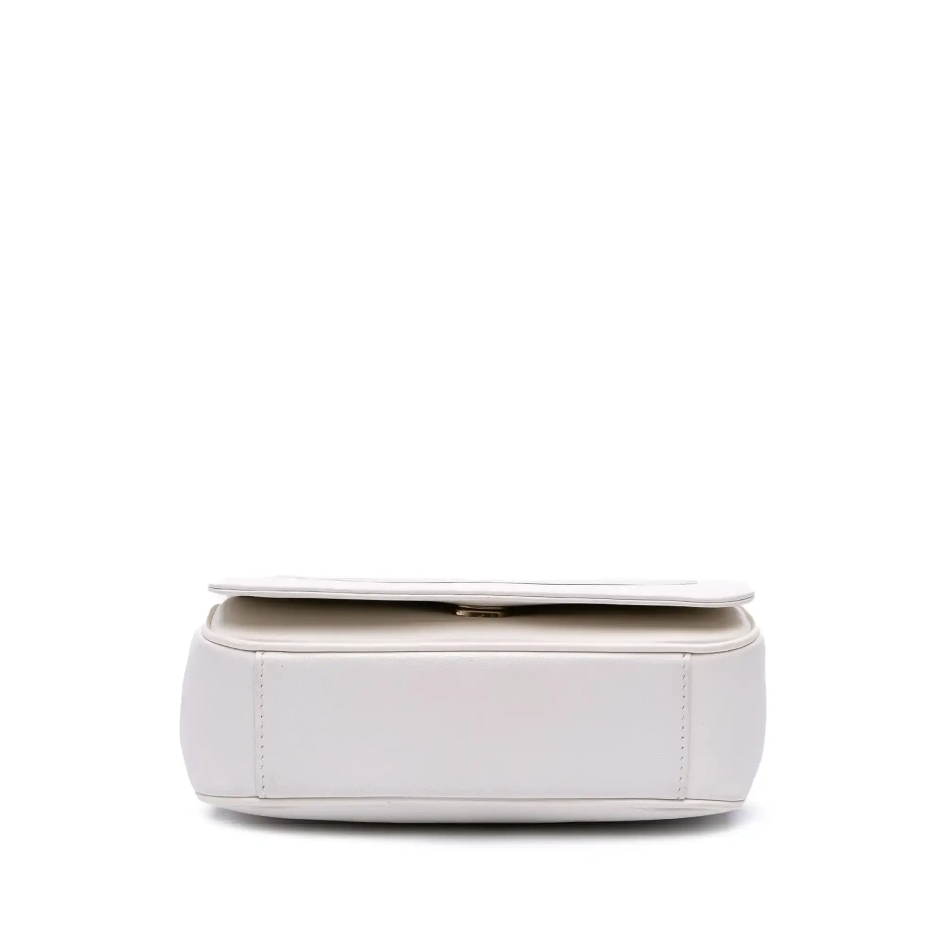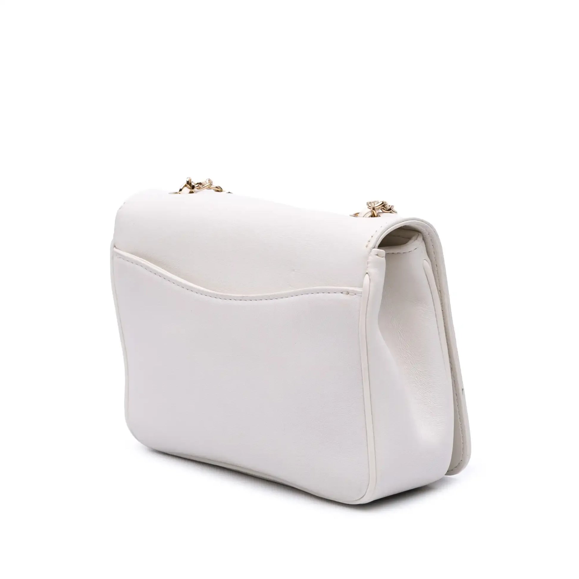 Description | The Mania flap bag features a lambskin leather body, a leather woven chain strap with leather guard, a front flap with magnetic closure, an exterior back slip pocket, and interior zip pocket. | ||||||||||||