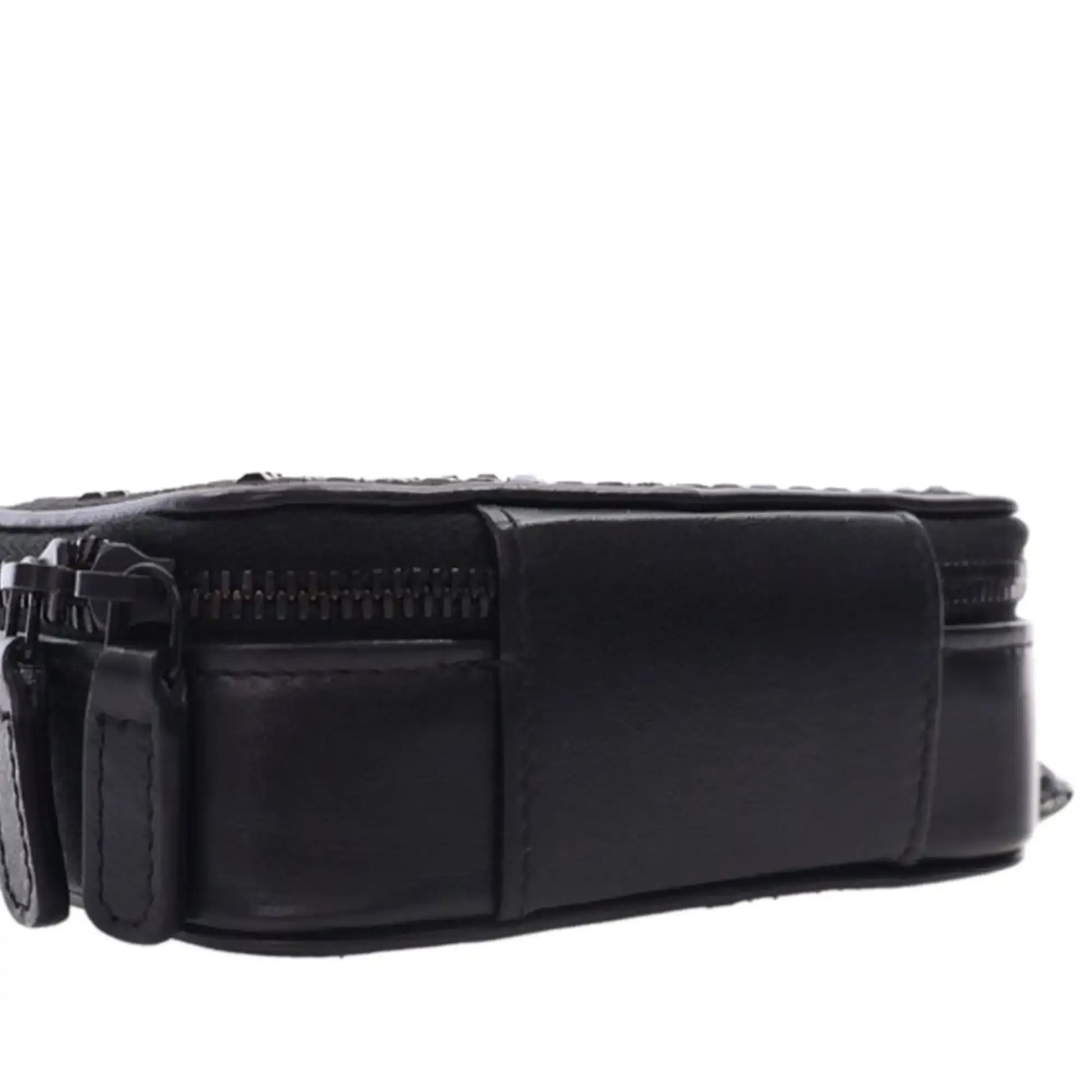 Description | This crossbody bag features a leather body with stud embellishments, a leather woven chain link strap, a two-way zip around closure, and partitioned open compartments. | ||||||||||||