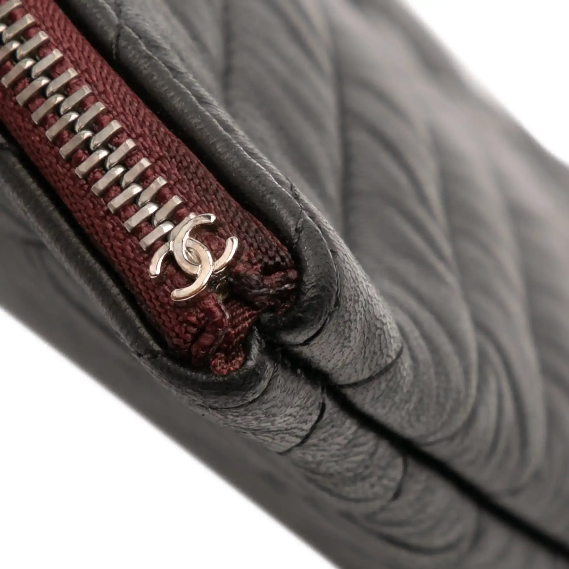 Description | This clutch bag features a chevron caviar leather body, a top zip closure, an exterior back slip pocket, and an interior zip pocket. | ||||||||||||