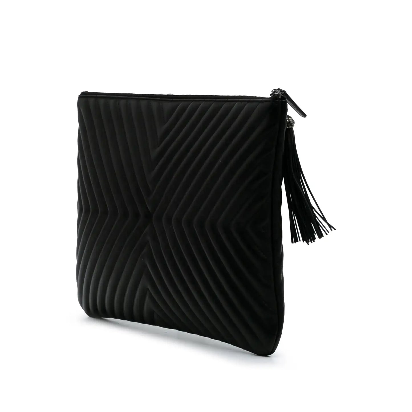 Description | This clutch bag features a quilted leather body with tassel detail, a top zip closure, and an interior zip pocket. | ||||||||||||