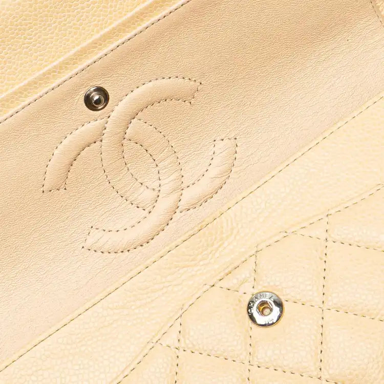 Description | This shoulder bag features a quilted caviar leather body, a leather woven chain strap, double front flaps with CC turn-lock closure, an exterior back slip pocket, and interior zip and slip pockets. | ||||||||||||