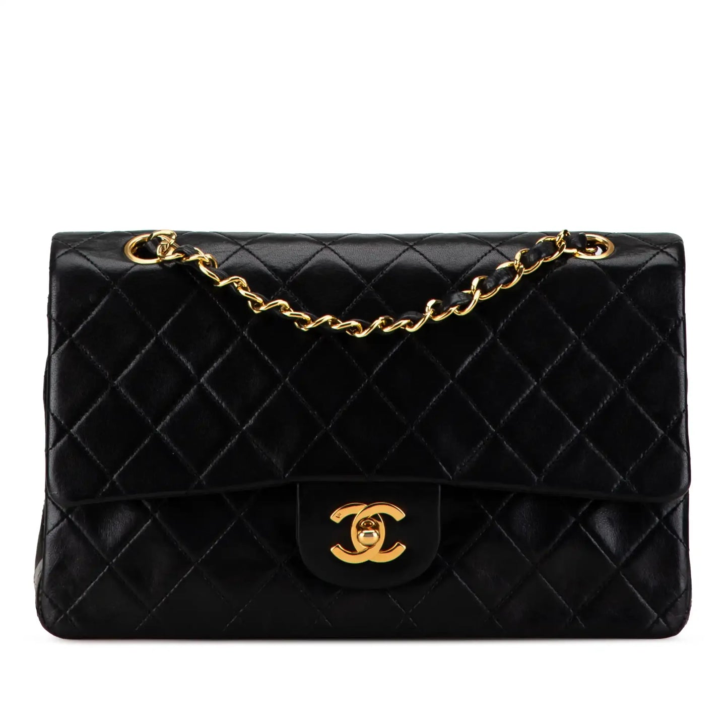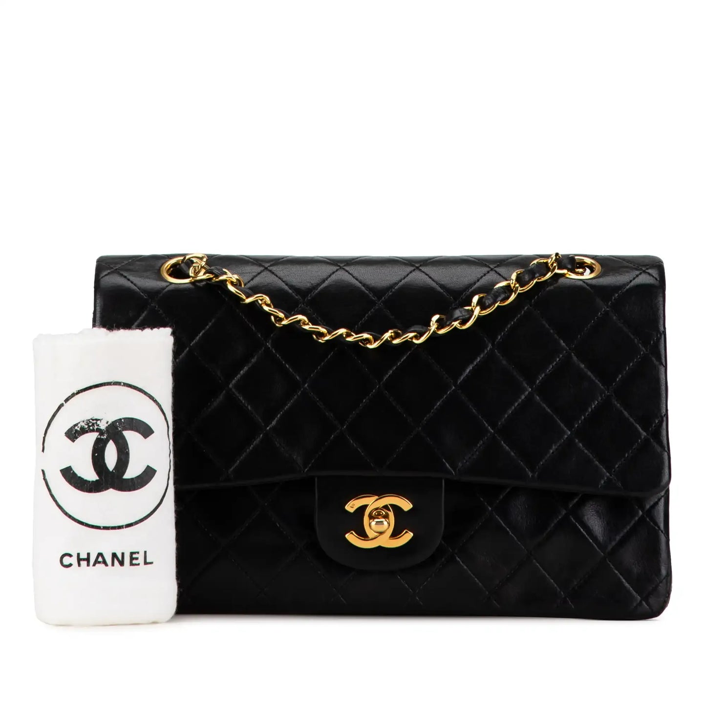 Description | This shoulder bag features a quilted lambskin body, leather woven chain straps, double front flaps with interlocking Cs and a twist lock closure, an exterior back slip pocket, and interior zip and slip pockets. | ||||||||||||