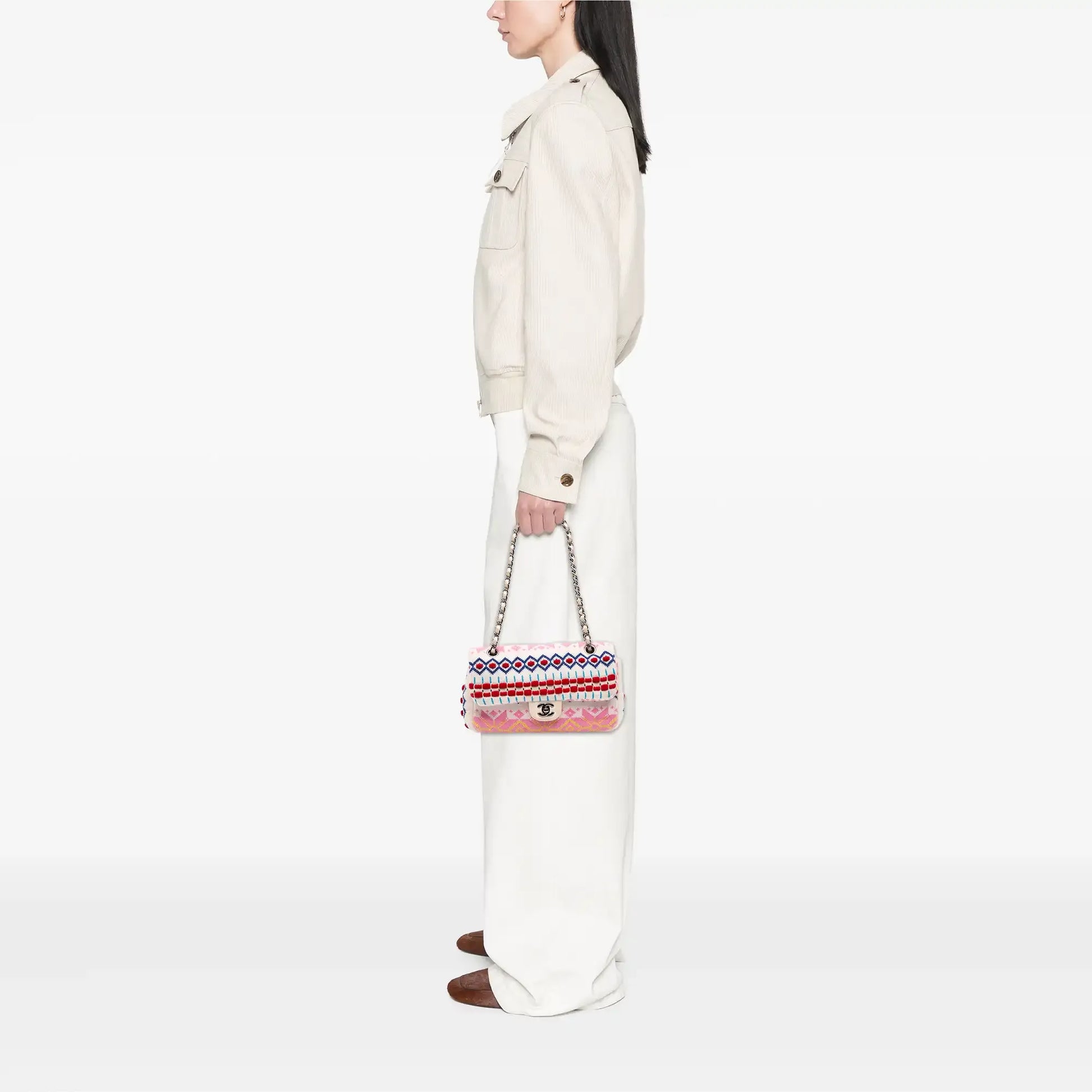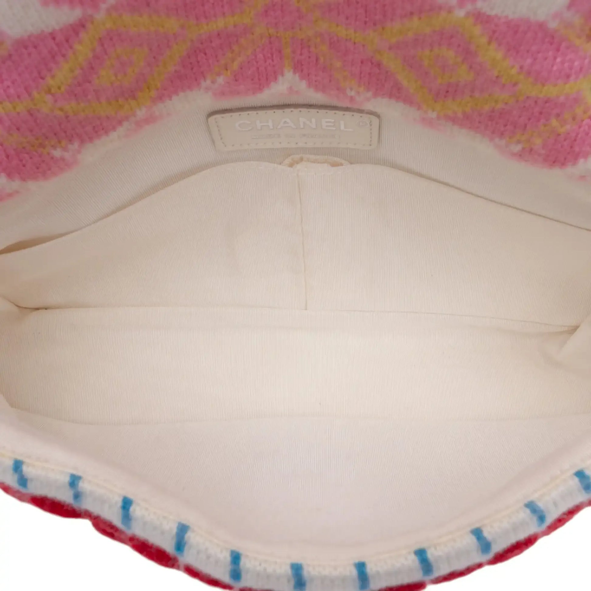 | Description | This Flap Bag features a cashmere wool knit body, leather woven chain link straps, a front flap with a CC turn-lock closure, and interior slip pockets. | ||||||||||||