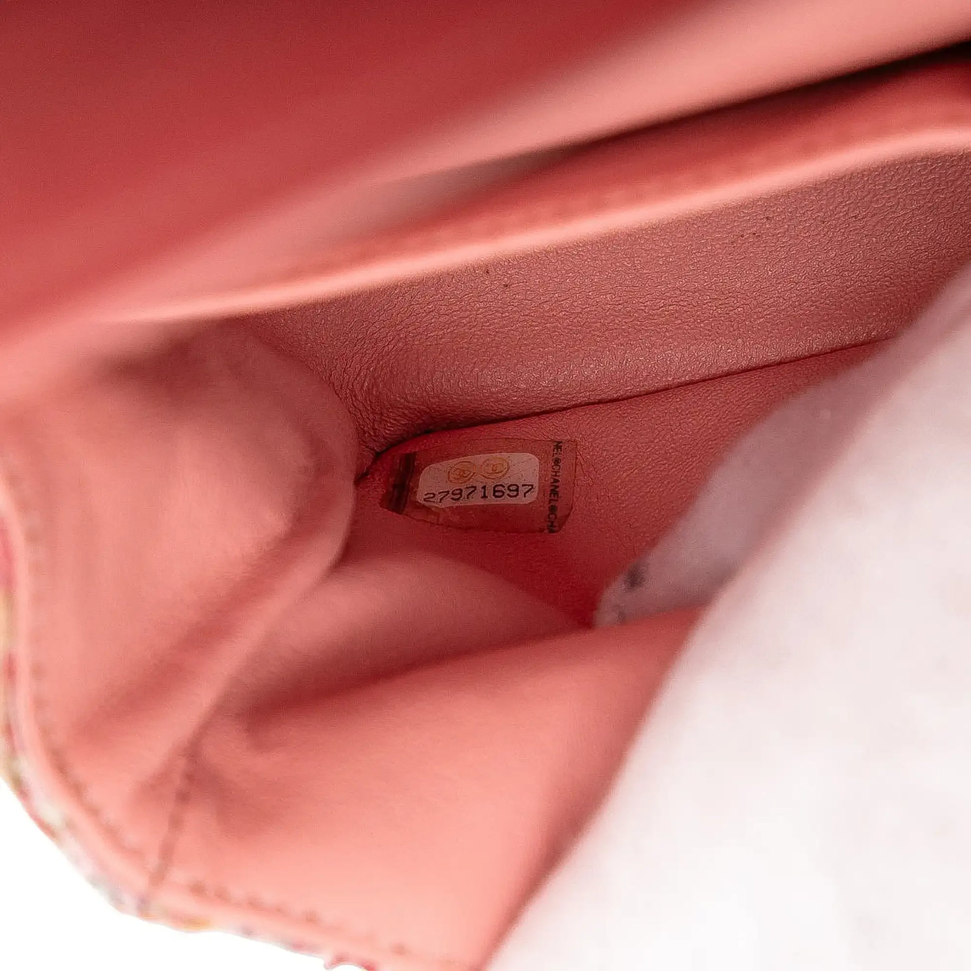 | Description | This flap bag features a tweed body, a leather-woven chain strap, a front flap with CC turn lock closure, an exterior back slip pocket, and interior zip and slip pockets. | ||||||||||||
