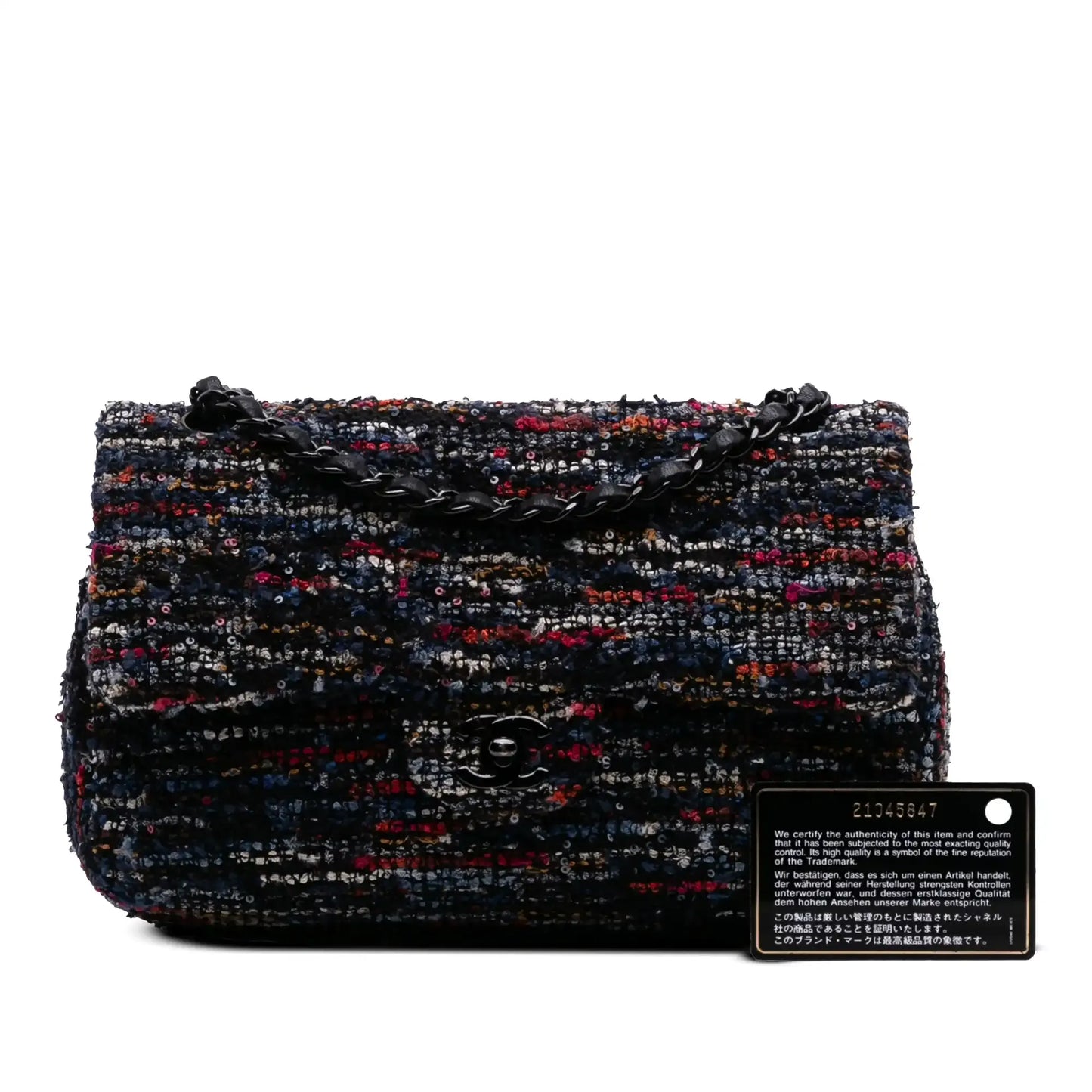 Description | This shoulder bag features a quilted tweed body, black tone hardware, leather woven chain-link shoulder straps, front flaps with interlocking Cs and a twist-lock closure, an exterior back slip pocket, and interior zip and slip pockets. | ||||||||||||