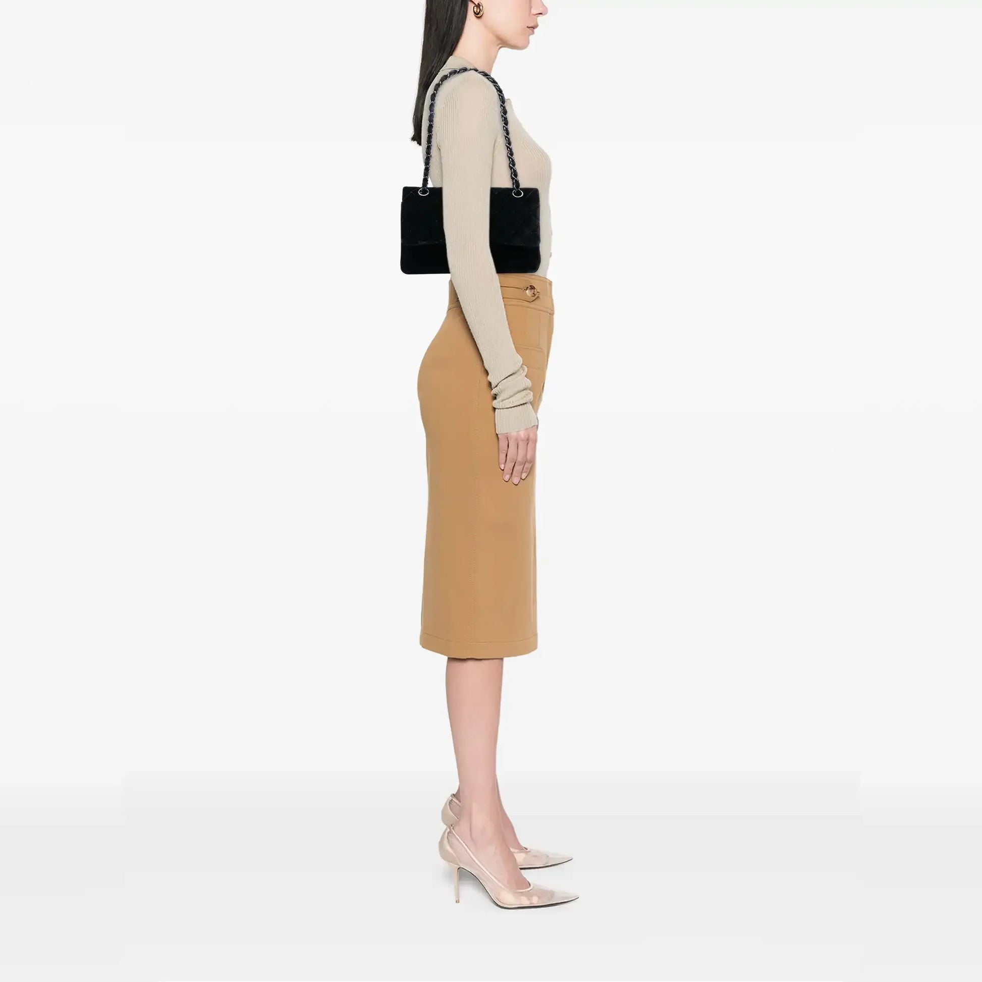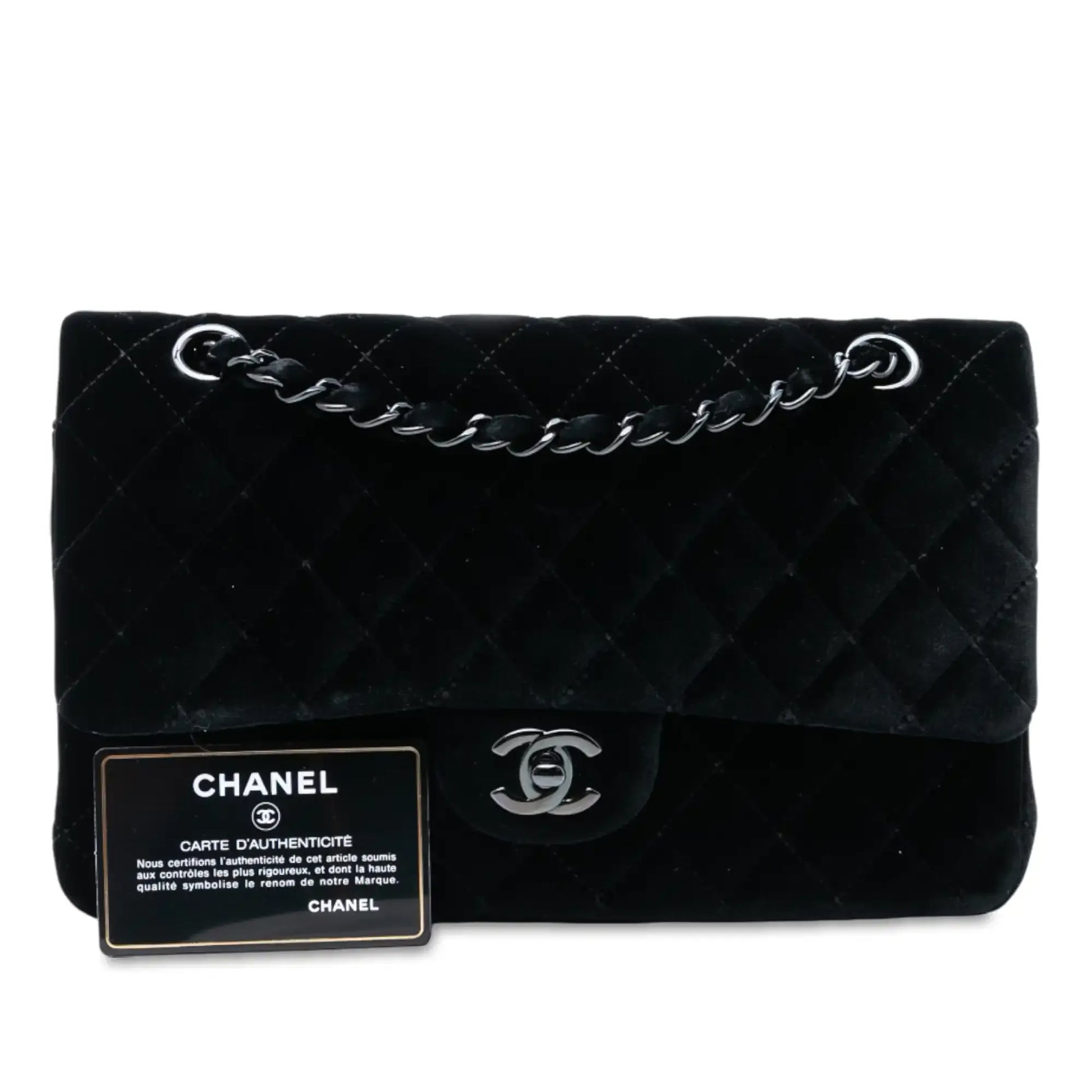 - DescriptionThis shoulder bag features a quilted velvet body, leather woven chain straps, double front flaps with interlocking Cs and a twist lock closure, an exterior back slip pocket, and interior zip and slip pockets.Condition