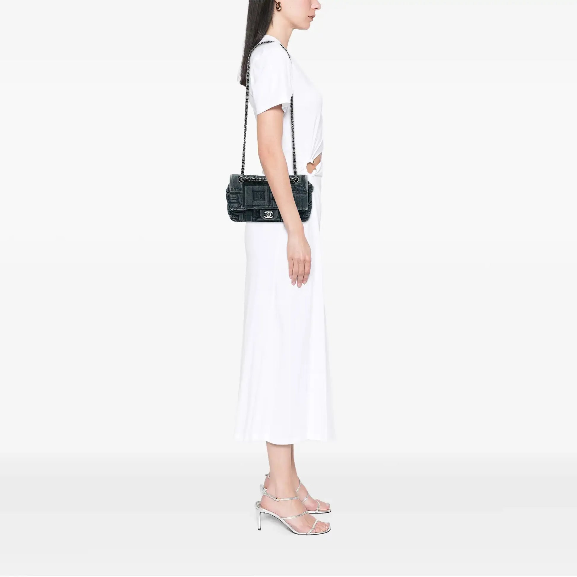 | Description | This shoulder bag features a denim body, a denim-woven chain link strap, a flap with CC turn lock closure, an exterior back slip pocket, and interior zip and slip pockets. | ||||||||||||