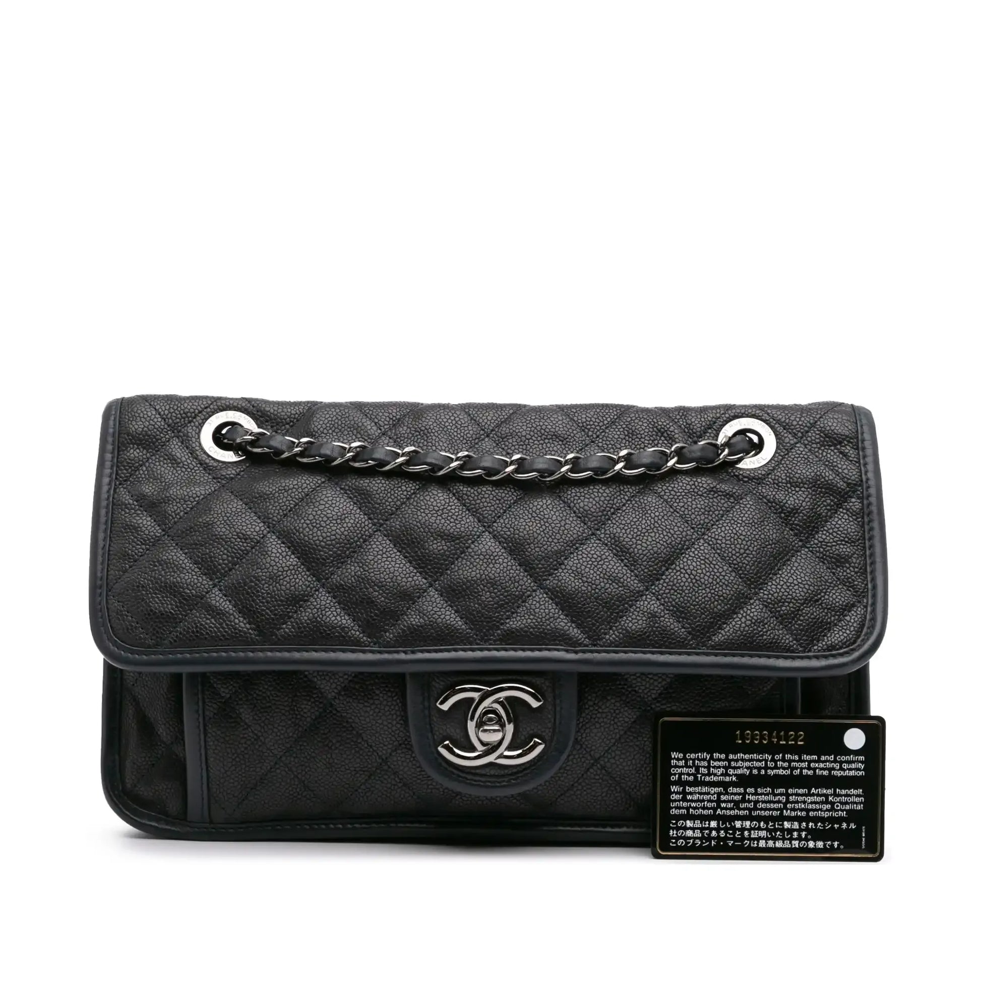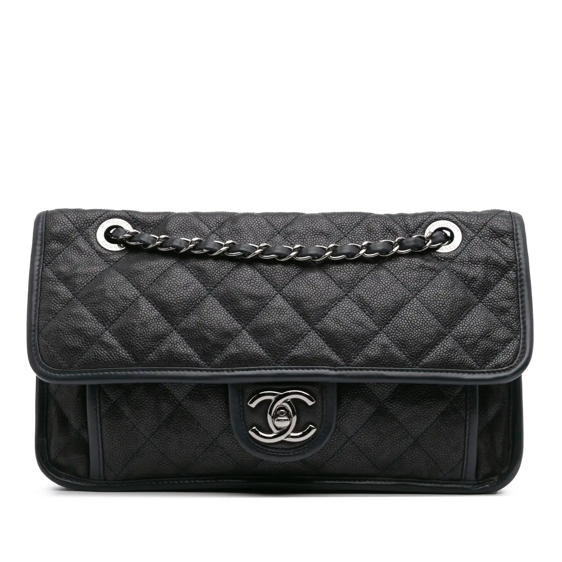 | Description | The French Riviera flap bag features a quilted leather body, leather-woven chain straps, a flap with interlocking CC turn lock closure, and an interior zip pocket. | ||||||||||||