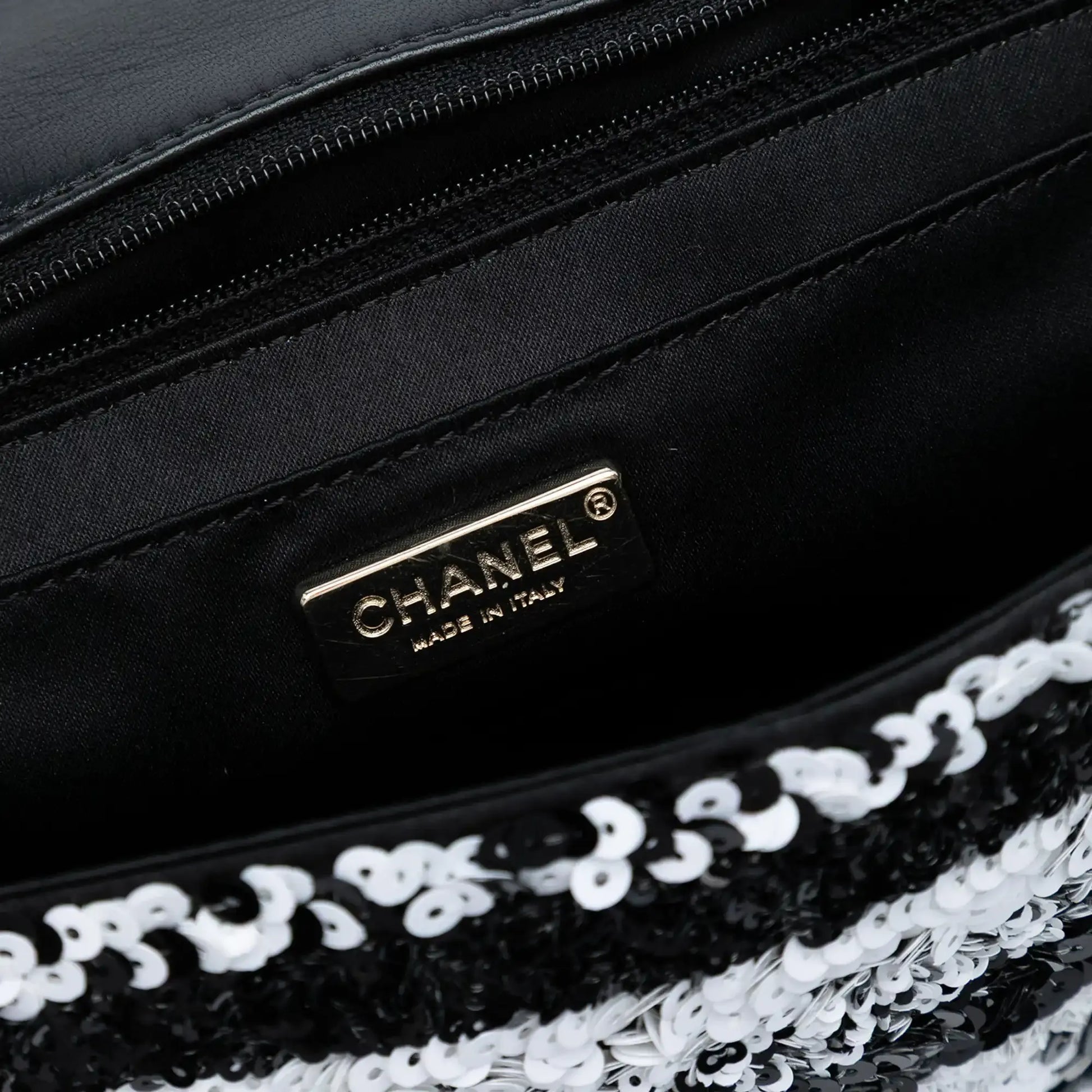 | Description | This flap bag features a sequined leather body, leather-woven chain straps, a front flap with CC turn lock closure, and interior zip and slip pockets. | ||||||||||||
