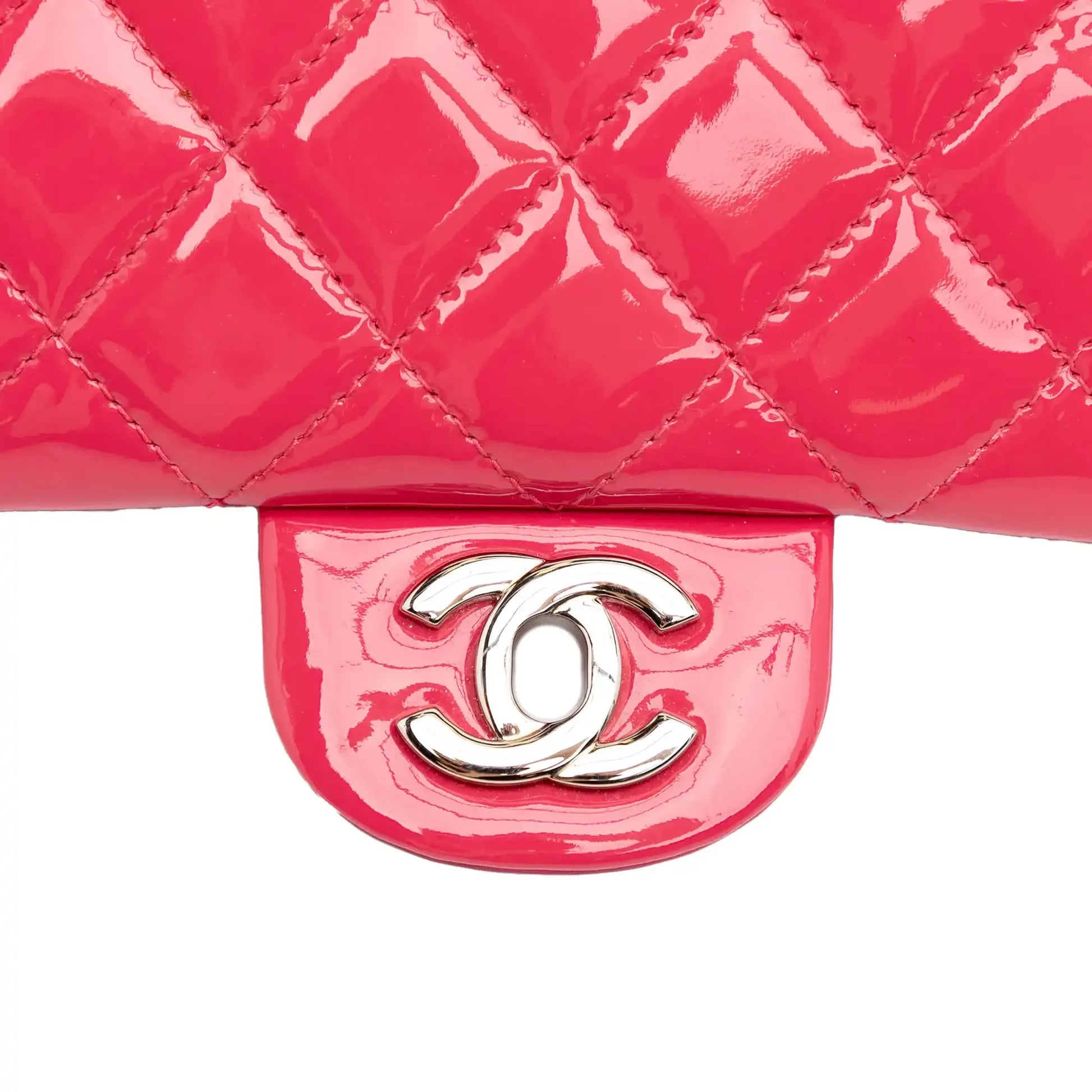 Description | This crossbody bag features a quilted patent leather body, a leather woven chain link shoulder strap, a front flap with a twist lock closure, an exterior back slip pocket, and interior zip and slip pockets. | ||||||||||||