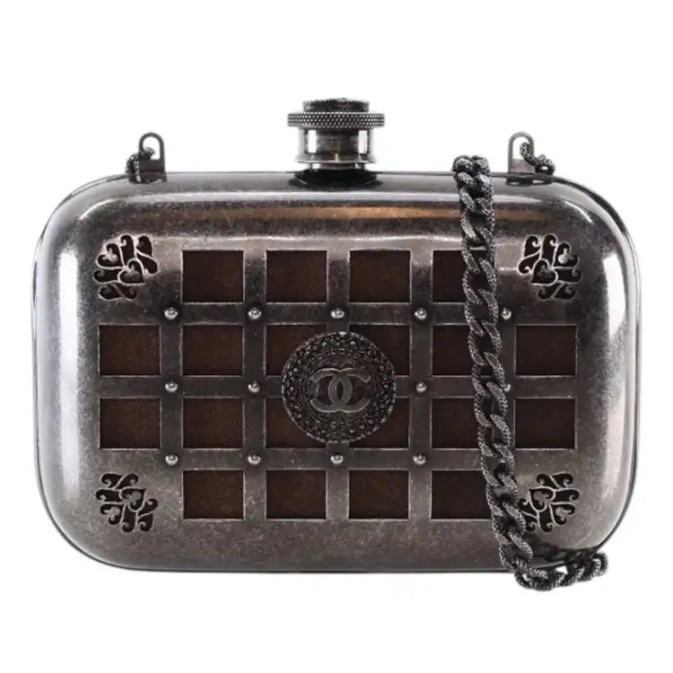 Chanel Paris Edinburgh Mini Gunmetal Grid Cage Clutch on Chain