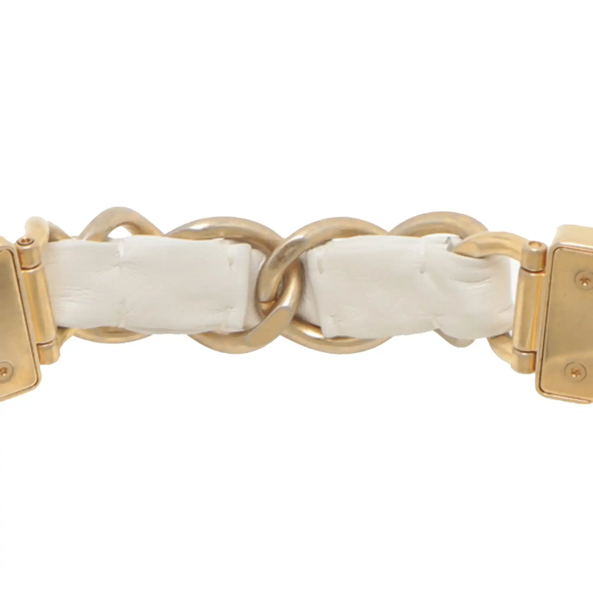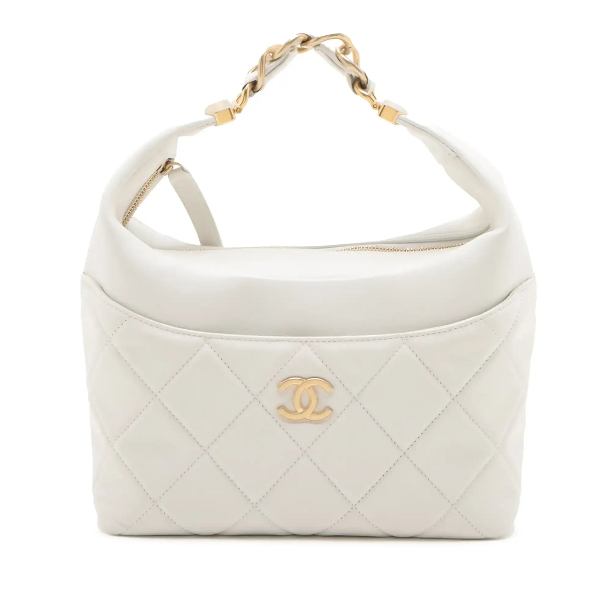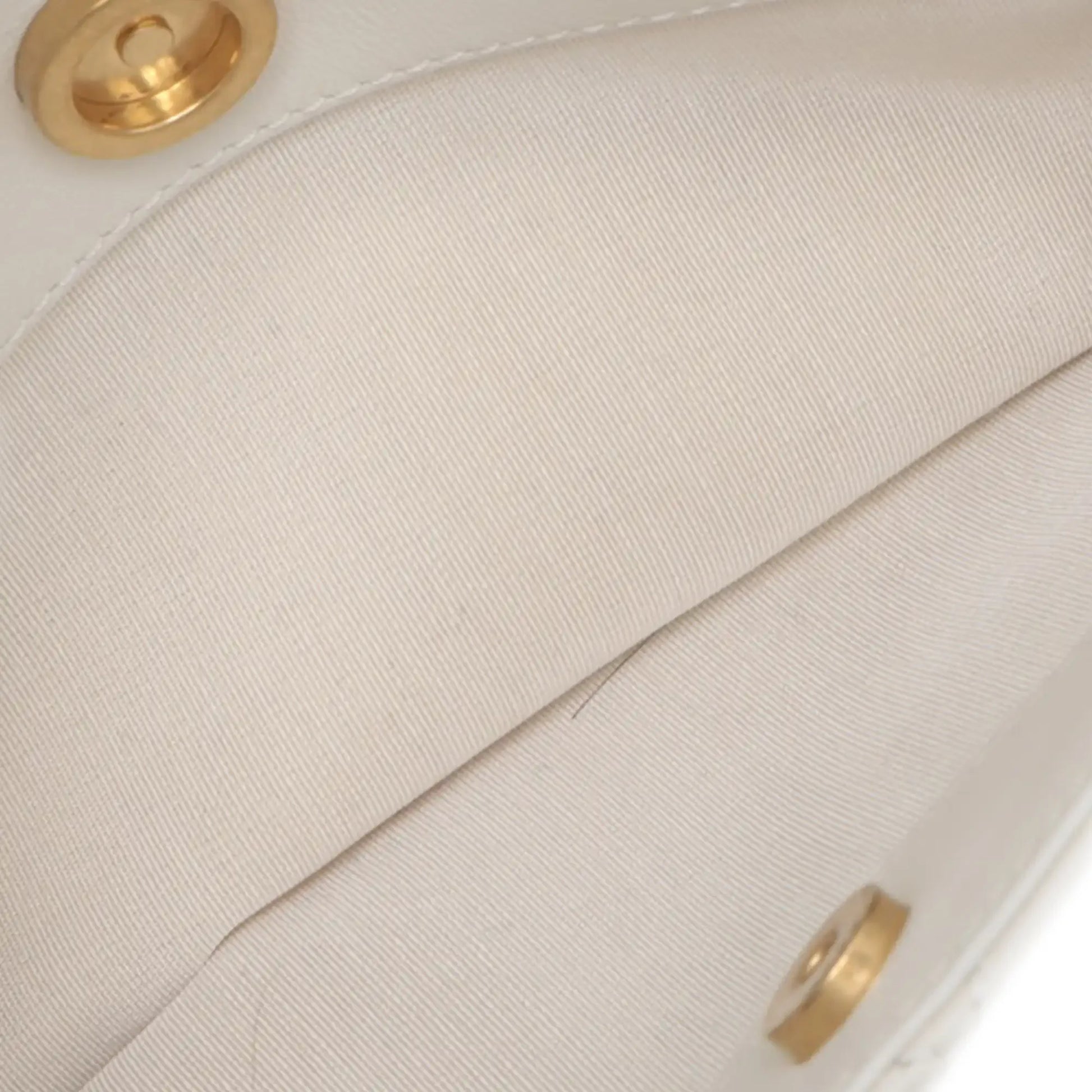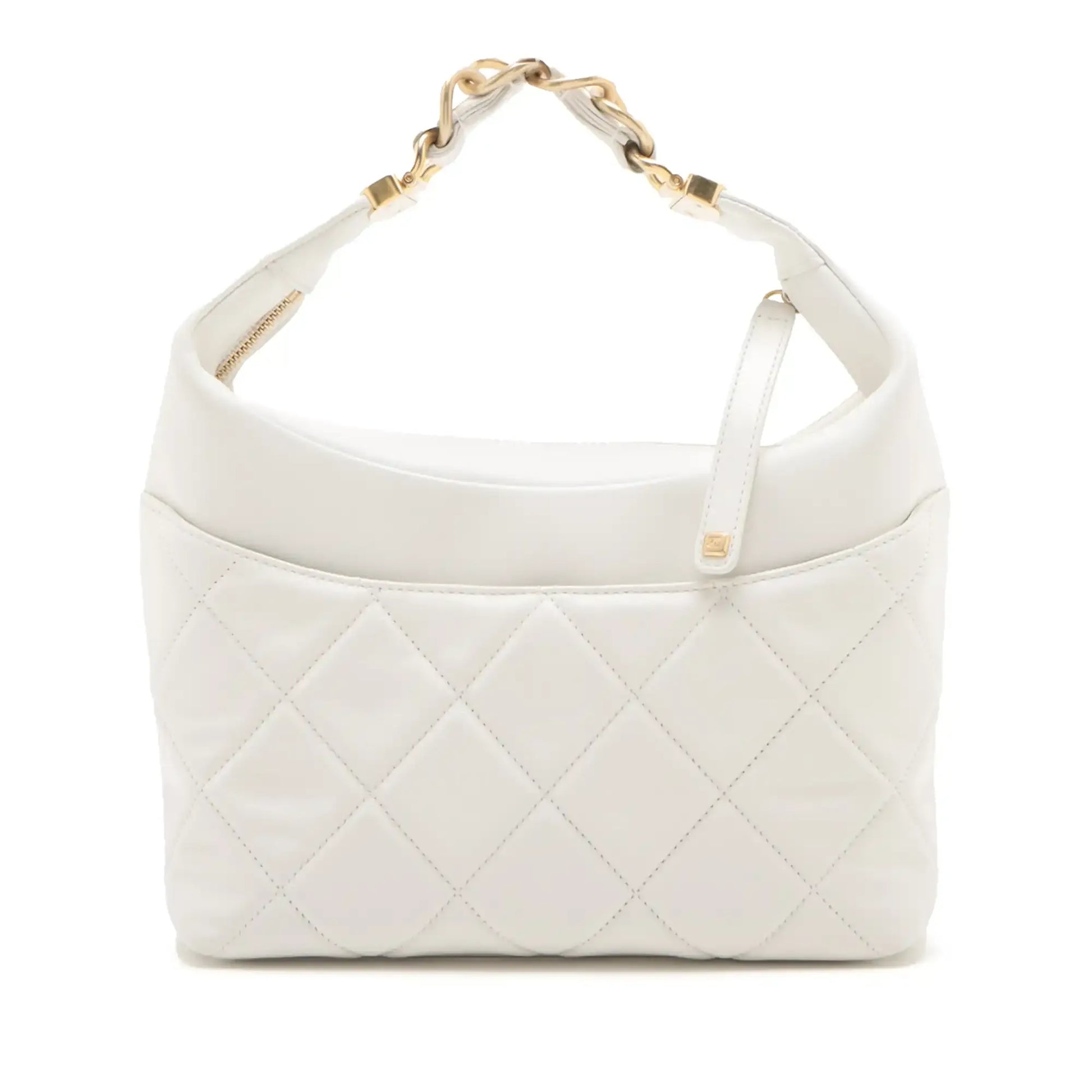 Description | This handbag features a quilted leather body, a leather-woven chain handle, a top zip closure, exterior slip pockets with snap button closure, and an interior slip pocket. | ||||||||||||