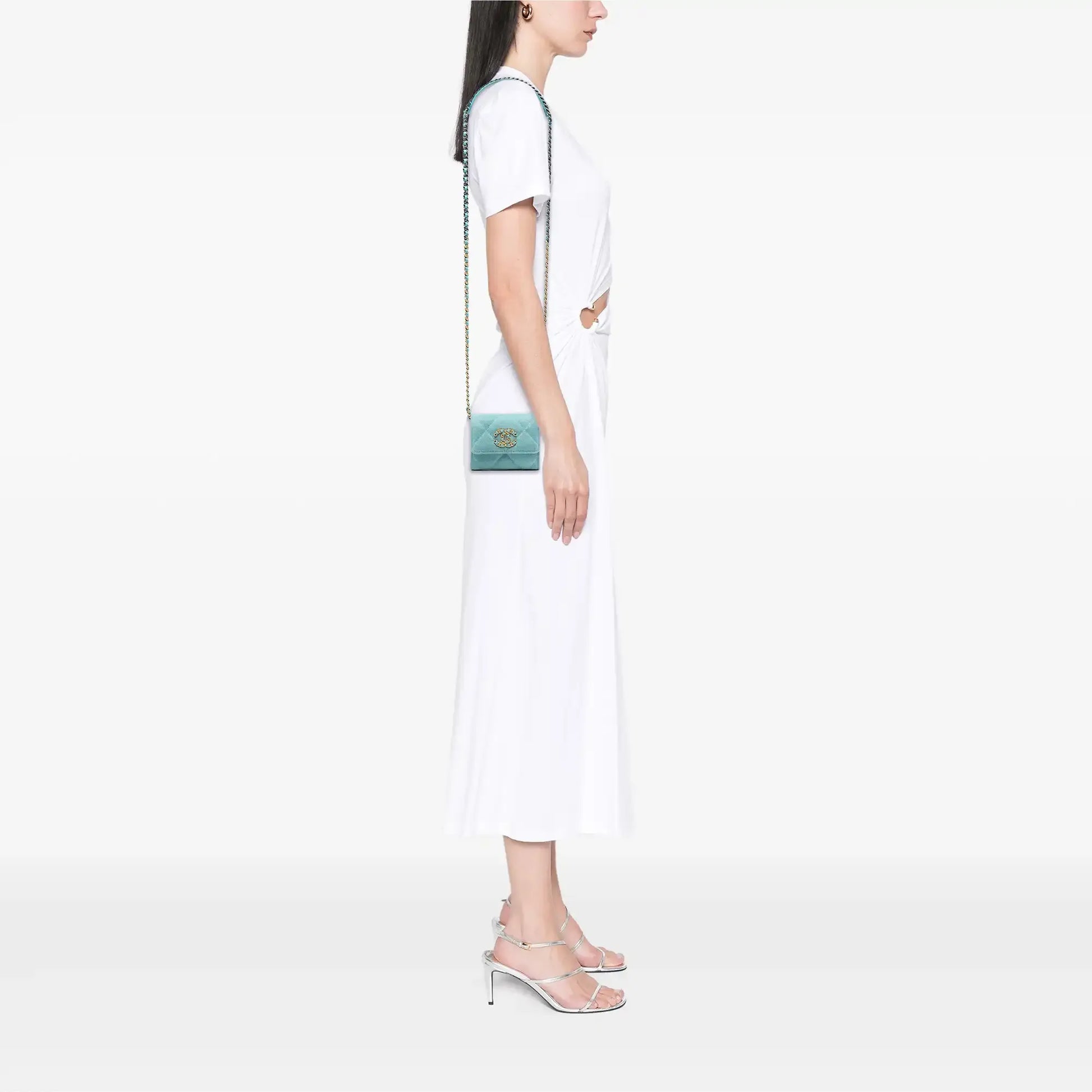 | Description | This crossbody bag features a quilted denim body, a leather-woven chain strap, a flap with magnetic snap closure, and an interior slip pocket. | ||||||||||||