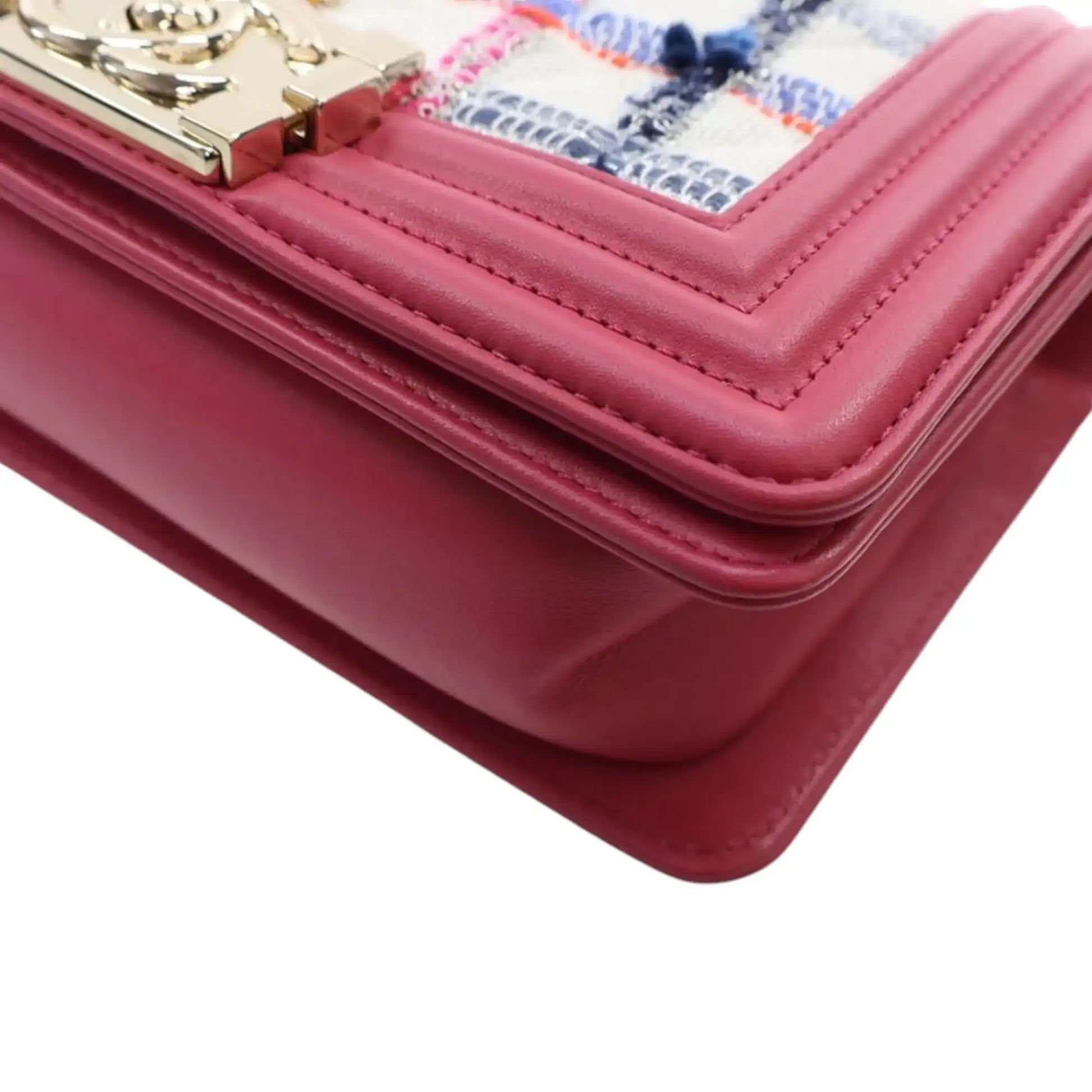 Description | The Boy Flap bag features a tweed and leather body, a curb chain shoulder strap, a flap with push-lock closure, and an interior slip pocket. | ||||||||||||