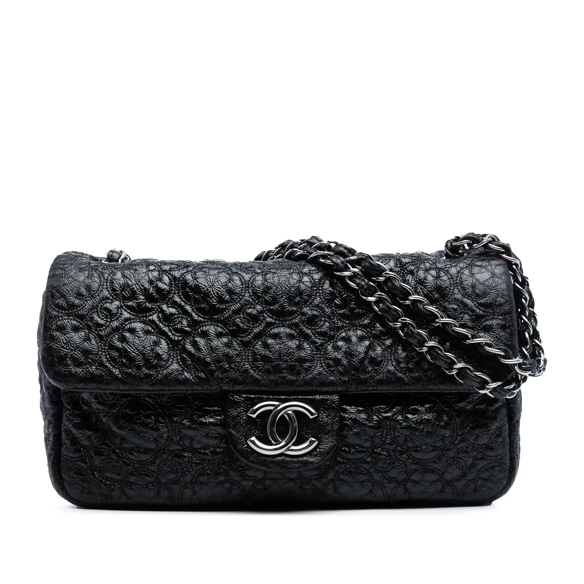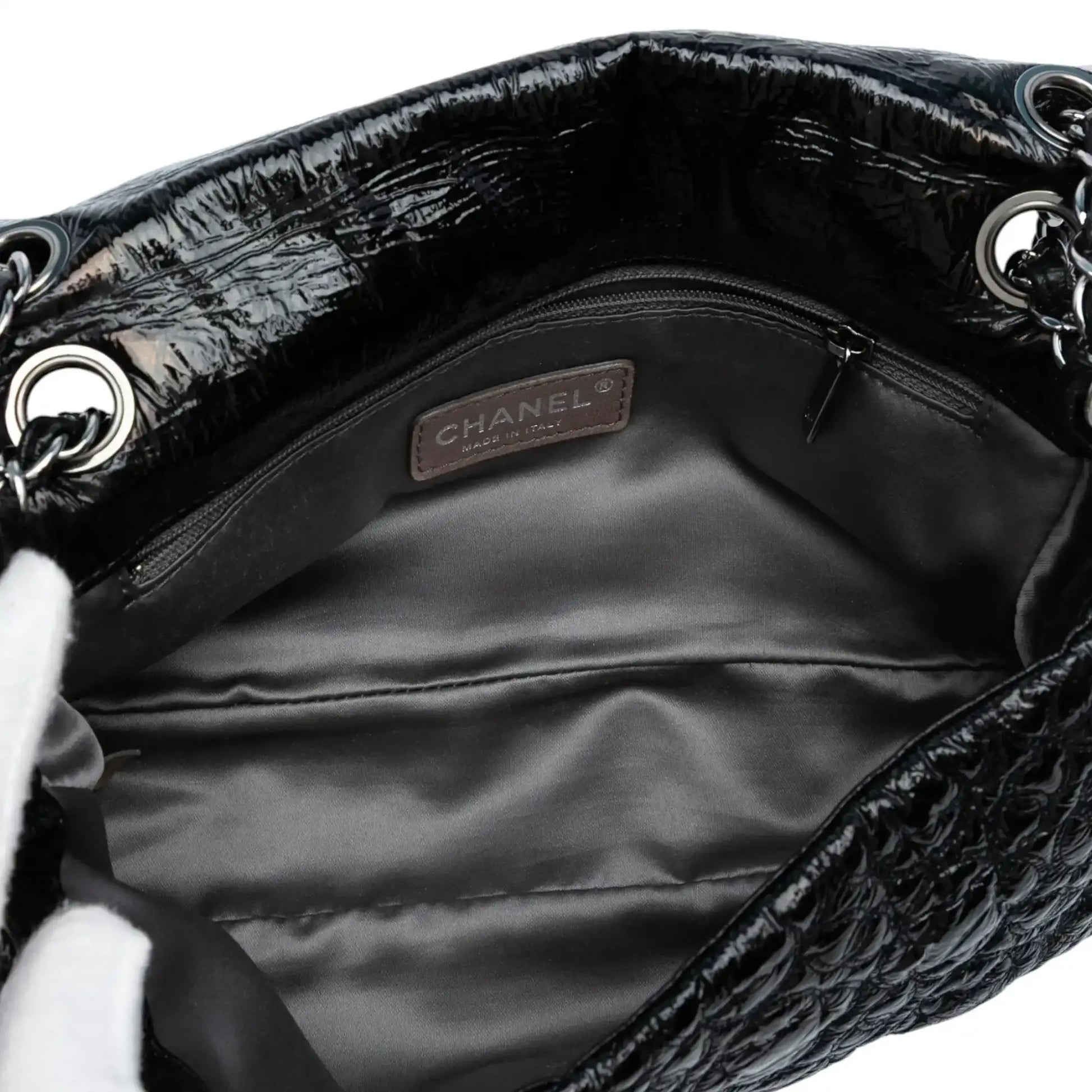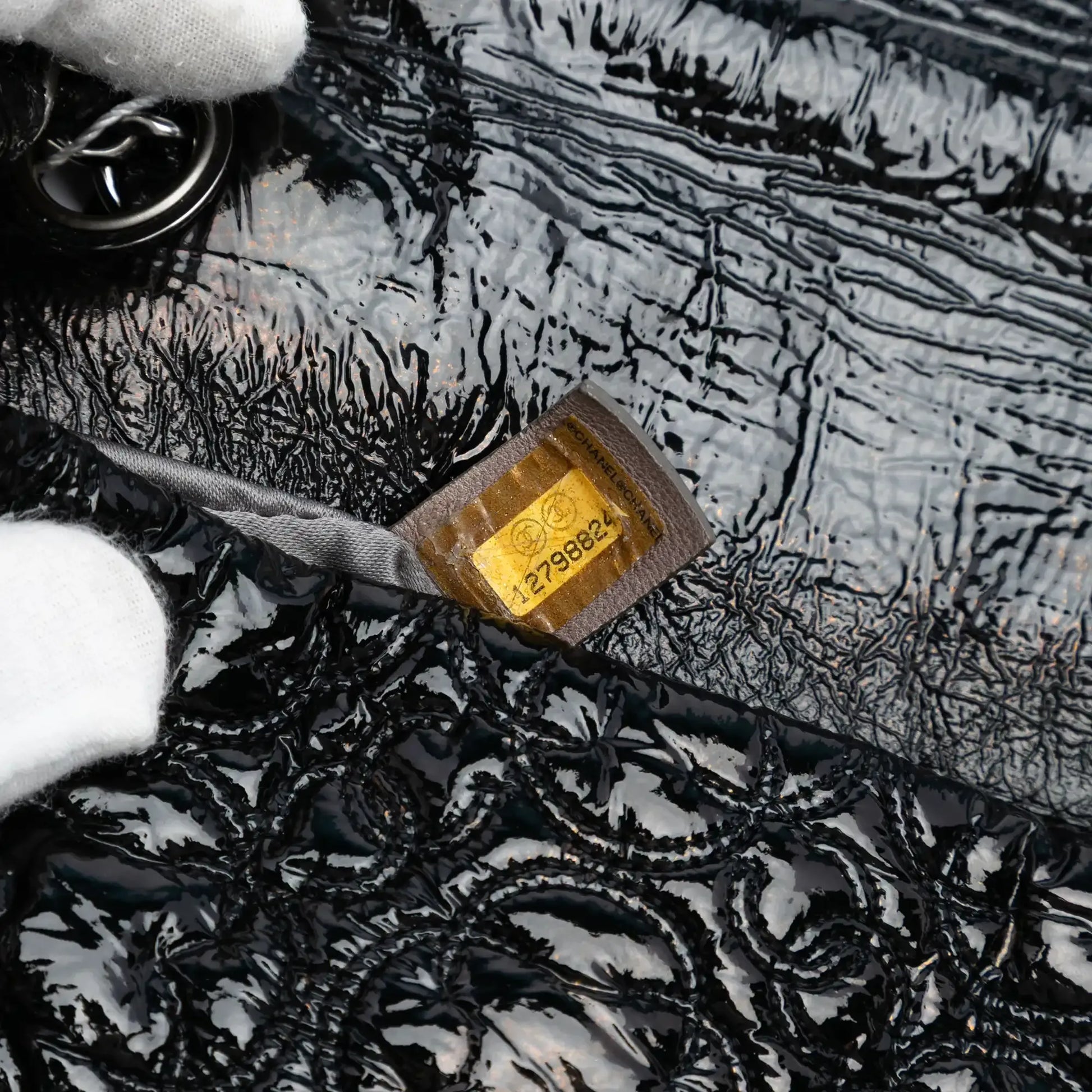 | Description | This shoulder bag features a a quilted vinyl body, vinyl woven chain straps, a front flap with magnetic snap closure, and an interior zip pocket. | ||||||||||||