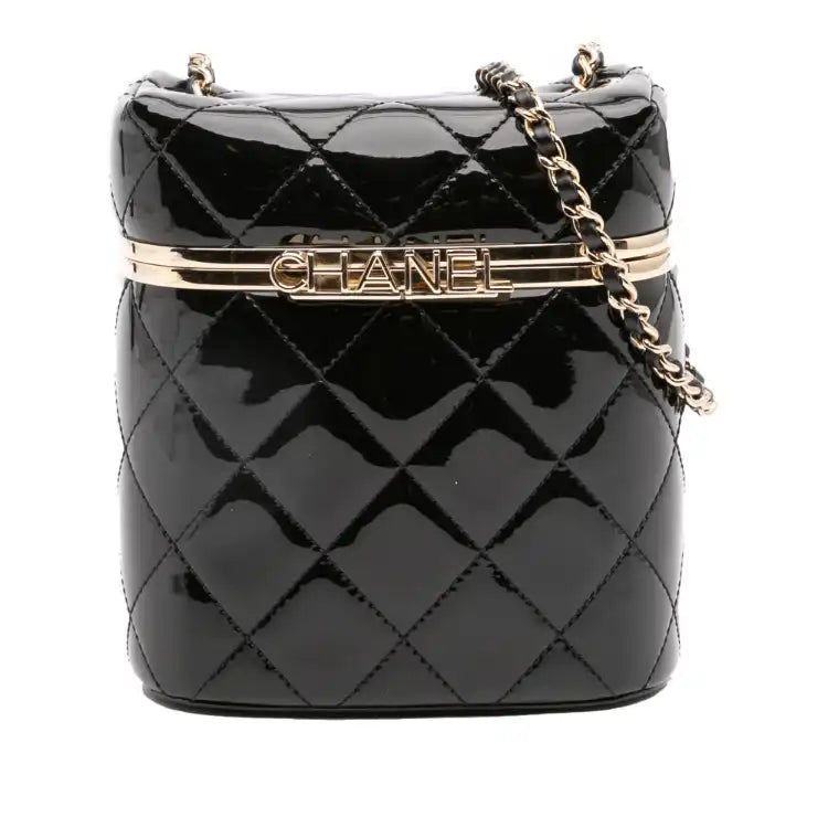 Description | This vanity bag features a quilted patent leather body, a leather-woven chain strap, a top clasp closure, and an interior slip pocket. | ||||||||||||