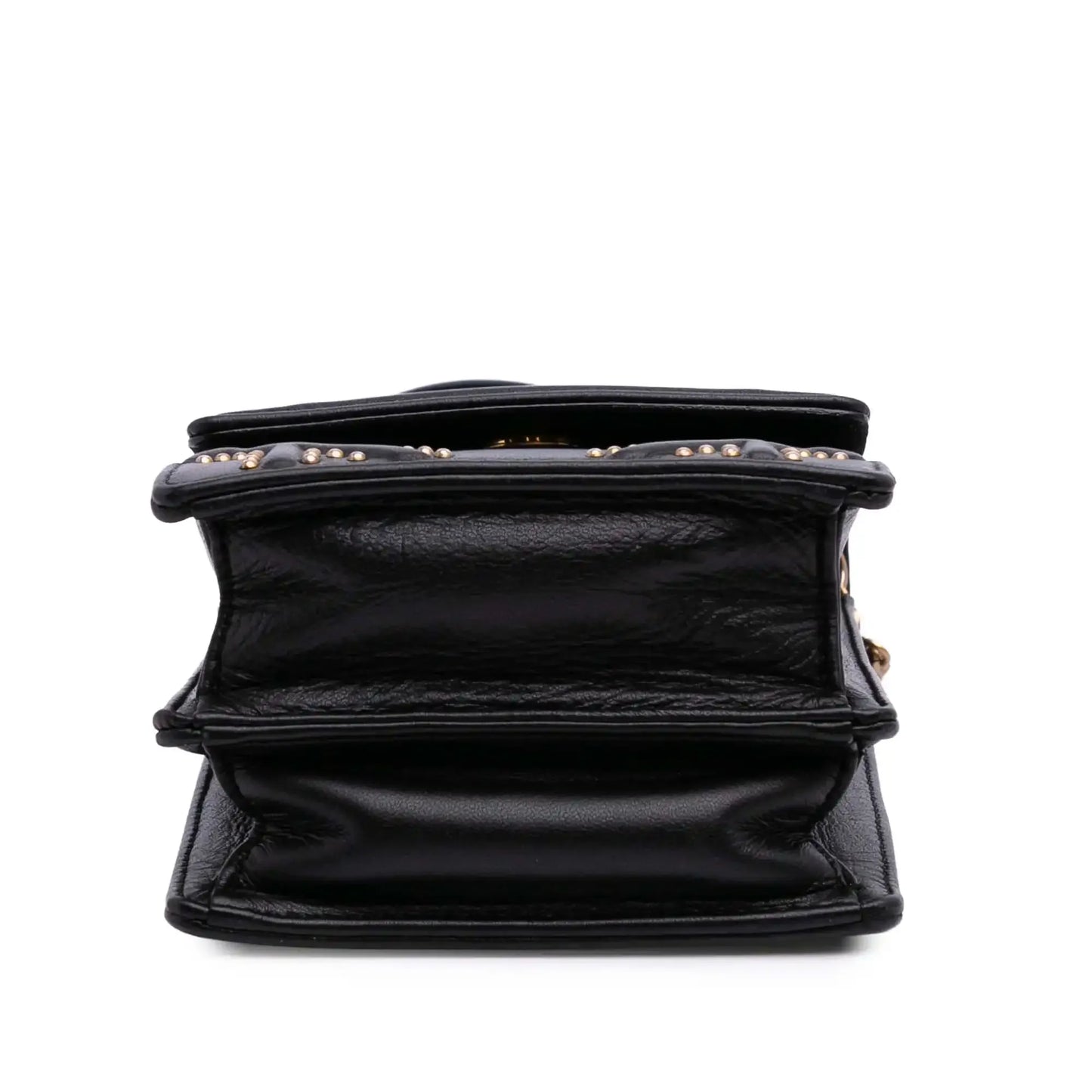 Description | The Diorama features a studded leather body, a chain link strap with leather guard, a front flap with a metal push lock closure, and interior slip pockets. | ||||||||||||