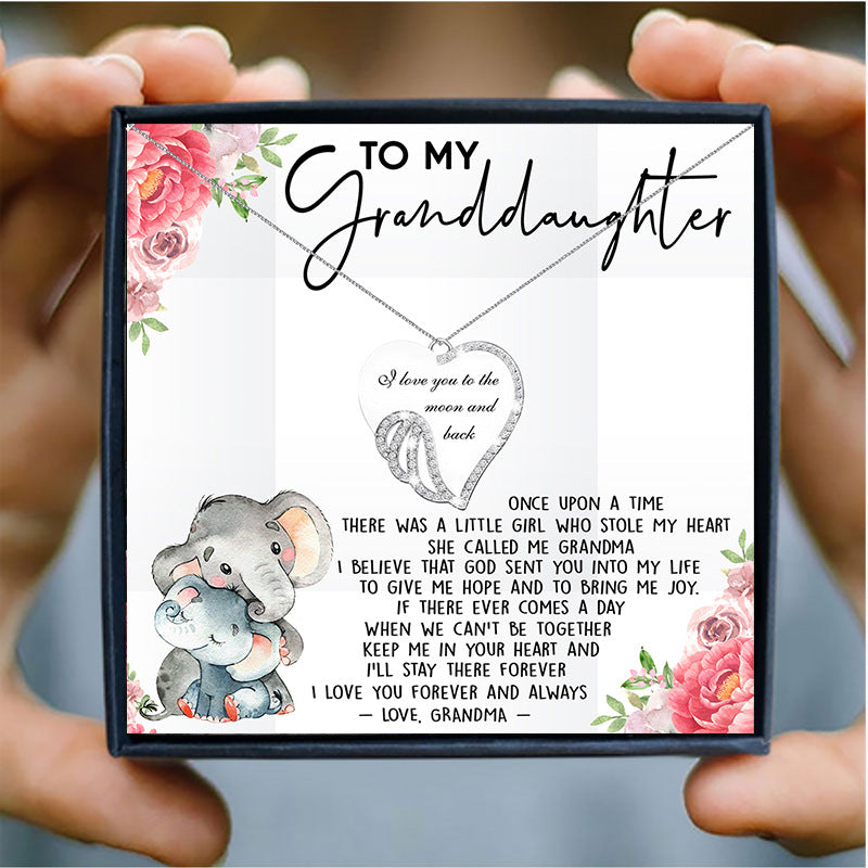 In order to give your granddaughter a beautiful and special gift, we recommend you this exquisite angel wings full diamond heart design gift box necklace.