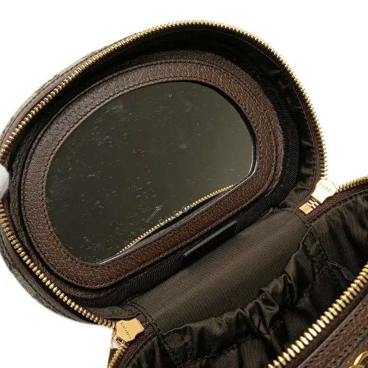 Description | This vanity bag features a coated canvas body with textured calf leather trim, a top flat leather handle, a top zip around closure, a mirror, and interior slip pocket and elastic bands. | ||||||||||||