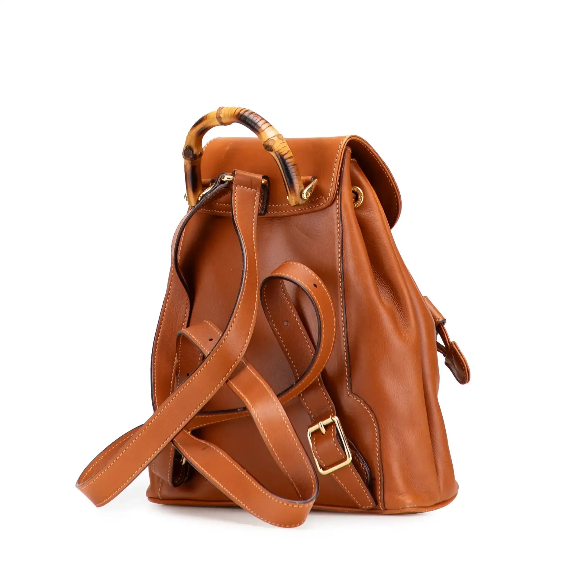 Description | This backpack features a leather body, flat leather back straps, a bamboo top handle, a top flap with drawstring closure, an exterior front flap pocket with bamboo twist lock closure, and an interior zip pocket. | ||||||||||||