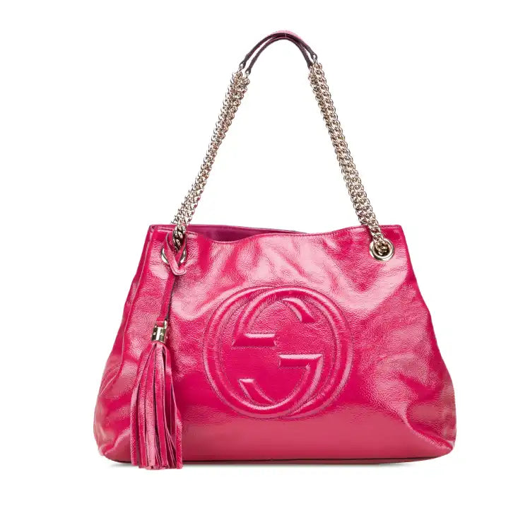 Description | The Soho Chain tote bag features a patent leather body, curb chain straps with leather guard and tassel detail, an open top with hook closure, and interior zip and slip pockets. | ||||||||||||