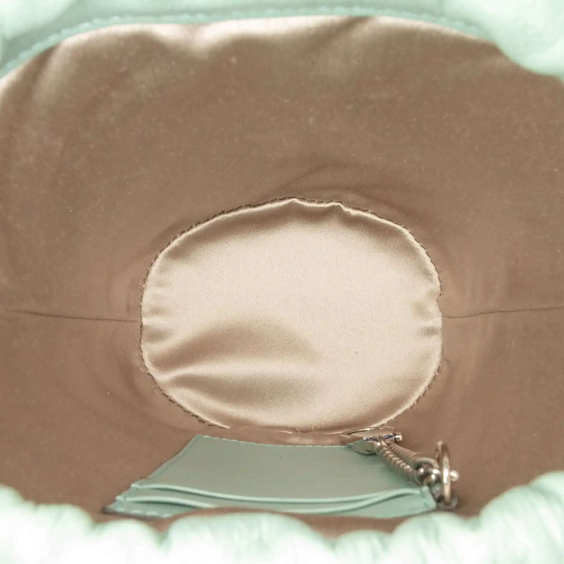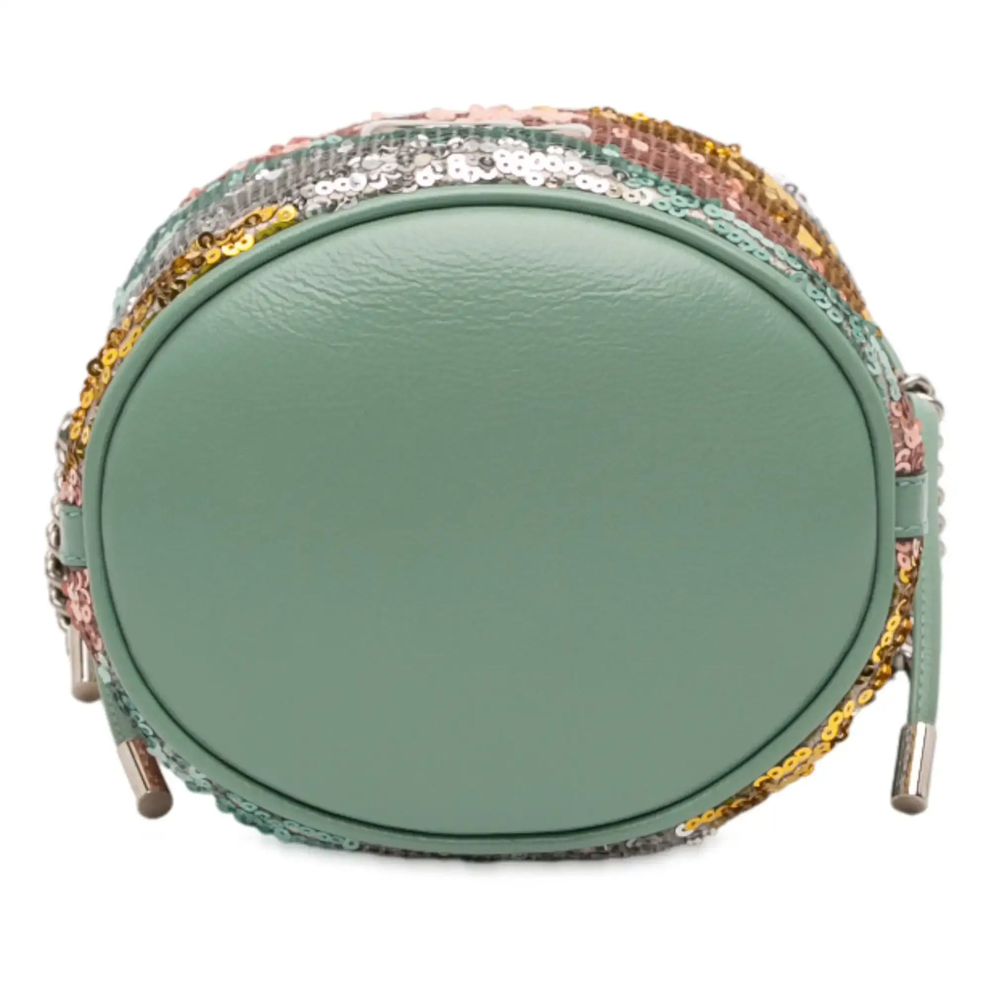 | Description | This bucket bag features a quilted leather body with sequins detail, a chain link strap, an open top with a drawstring closure, and interior slip pockets. | ||||||||||||