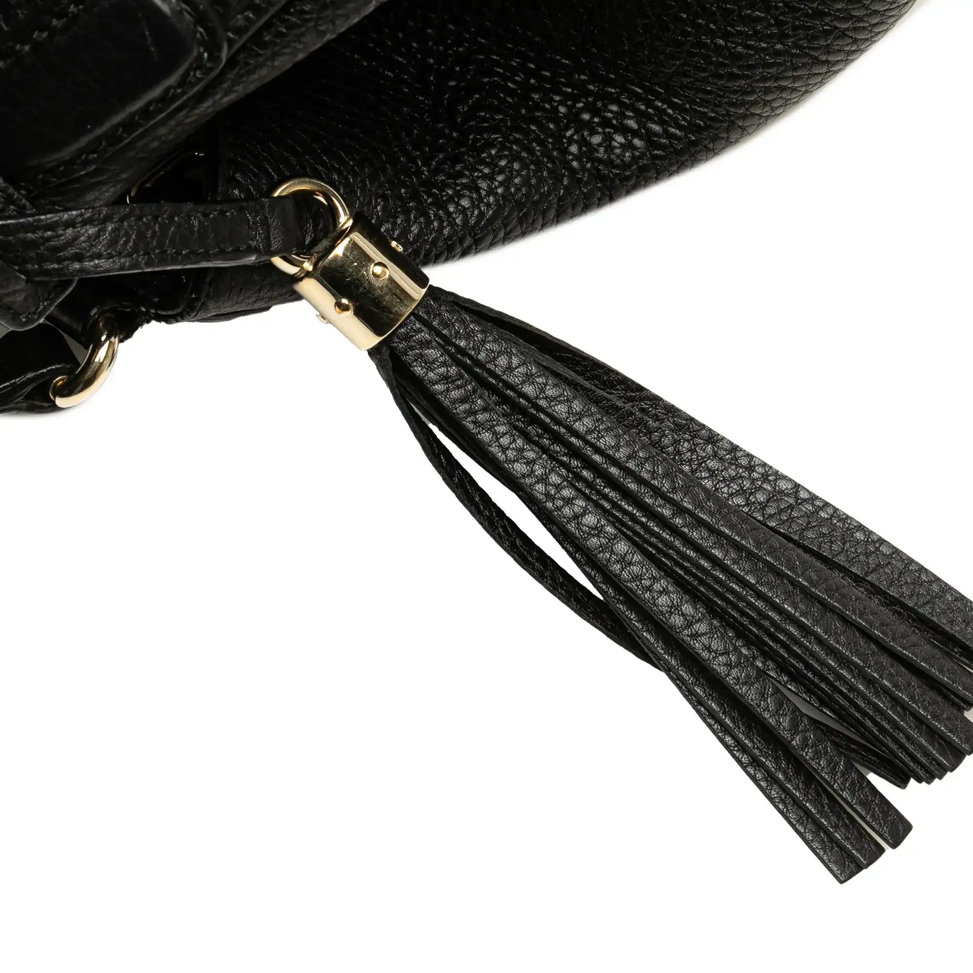 Description | The Soho features a leather body, flat leather handles with tassel details, an open top with lobster clasp closure, and interior zip and slip pockets. | ||||||||||||