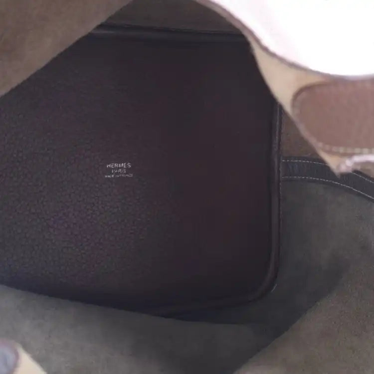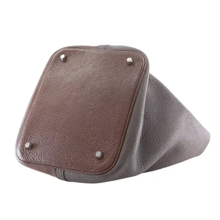Description | This Picotin 22 features a Togo leather body in Etoupe and Brulee colors, flat leather handles, and a top pull through strap with padlock closure. | ||||||||||||