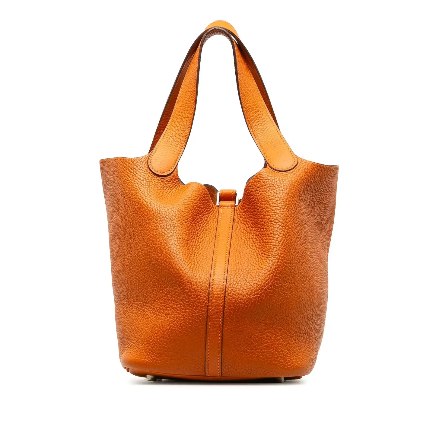 Description | The Picotin 22 features a leather body, flat handles, and an open top with a flat strap and buckle closure. | ||||||||||||