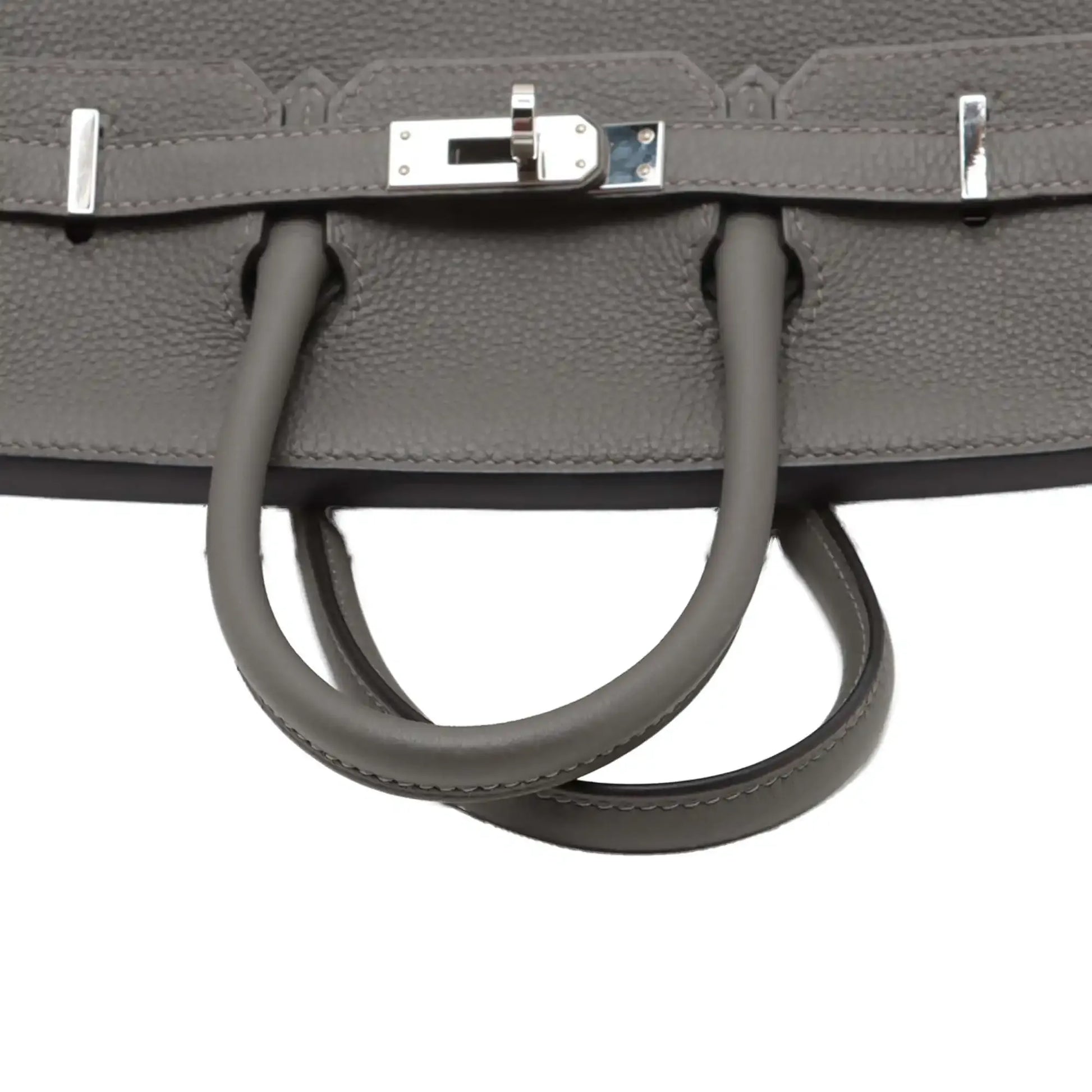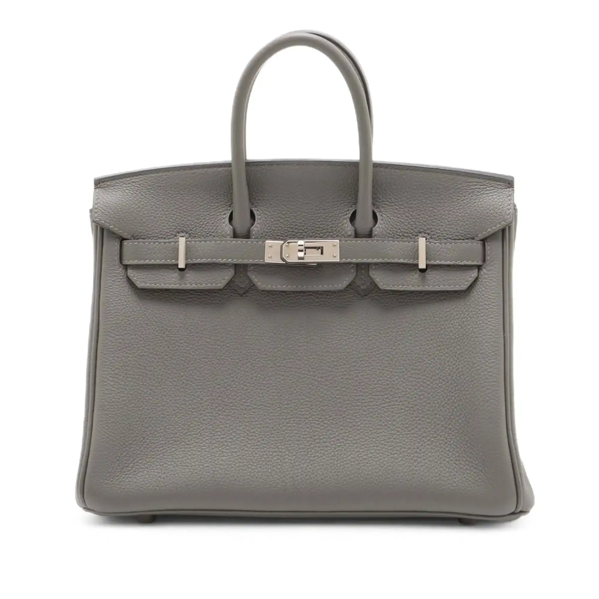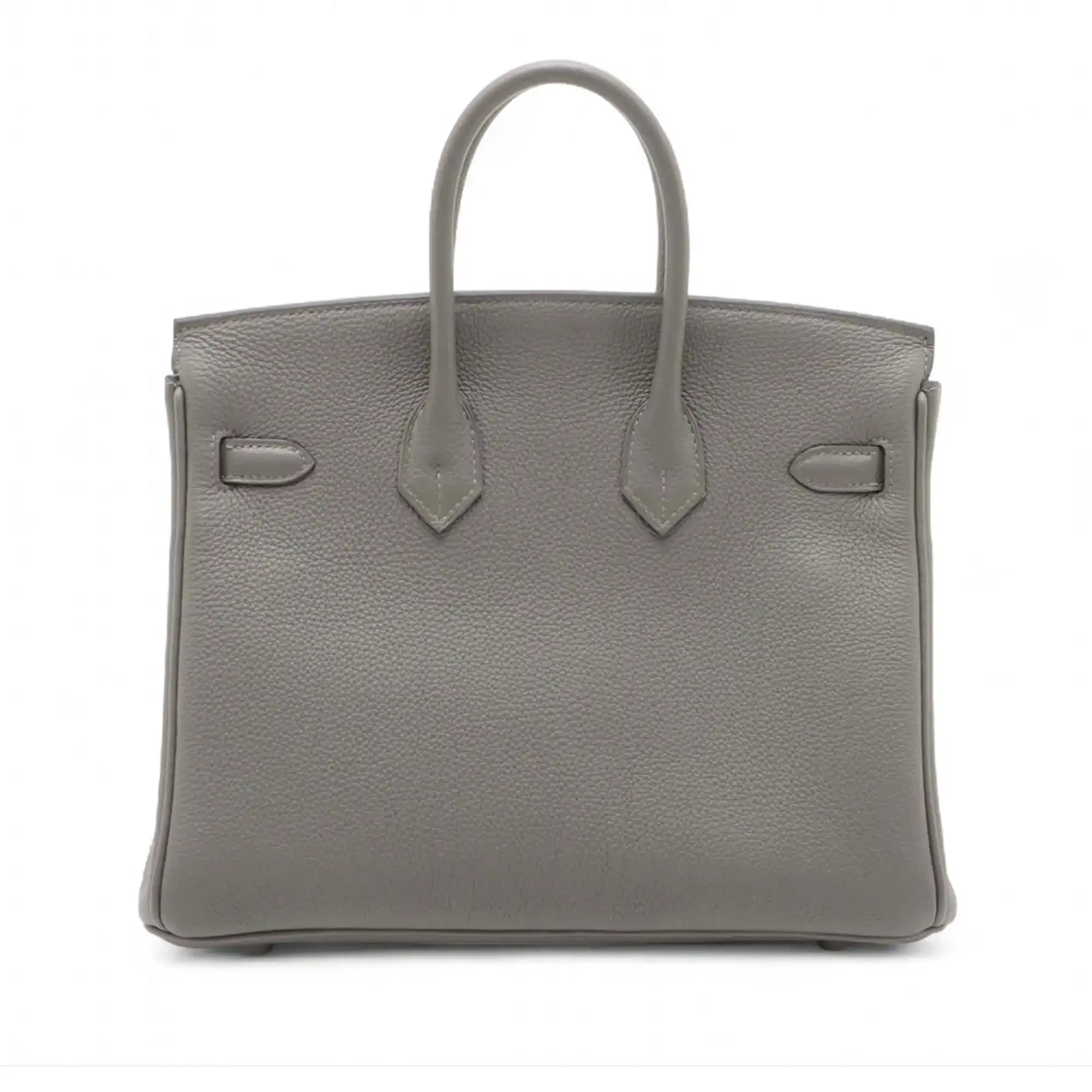| Description | The Birkin 25 features a togo leather body in Gris Meyer color, rolled leather handles, a front flap with turn-lock closure, and interior slip and zip pockets. | ||||||||||||