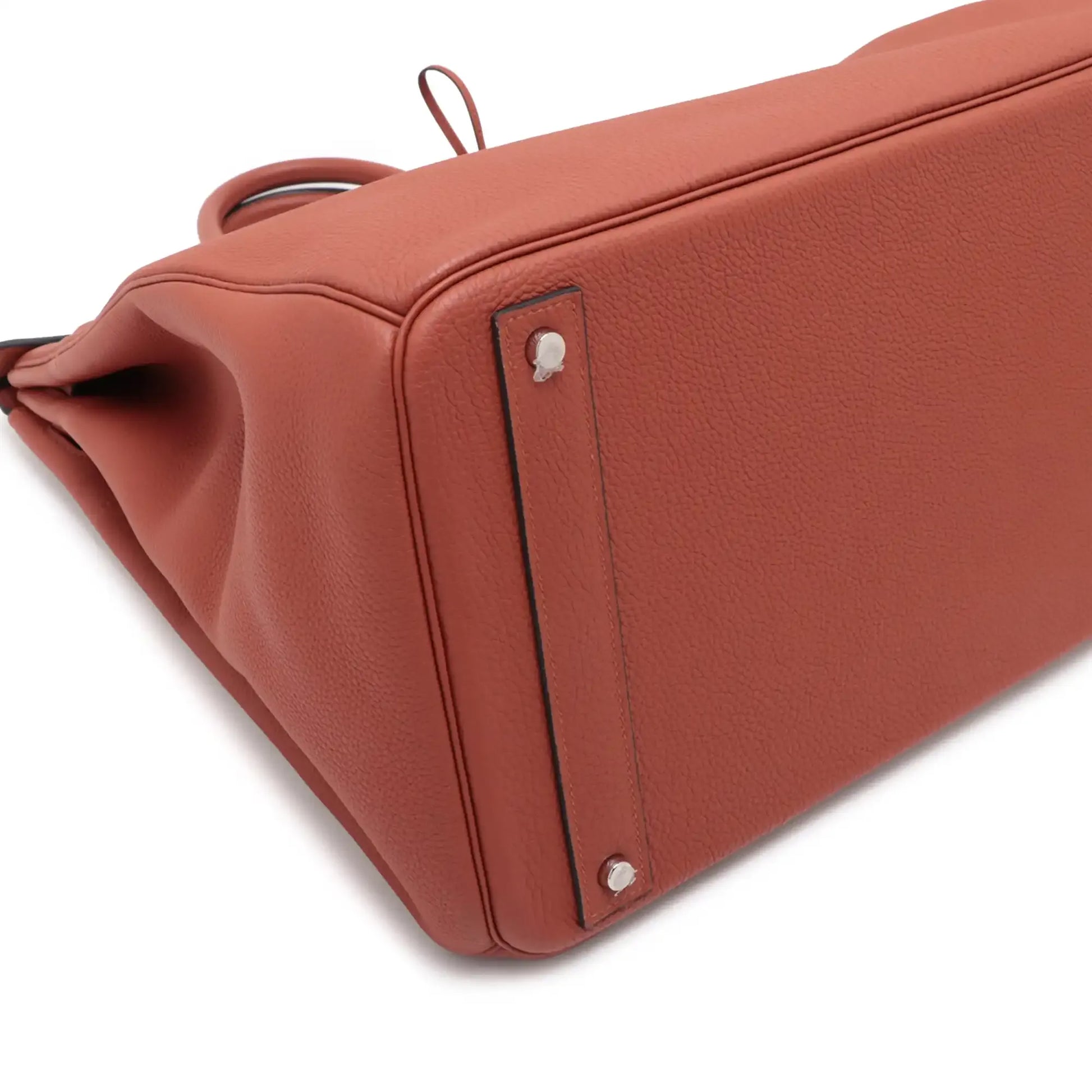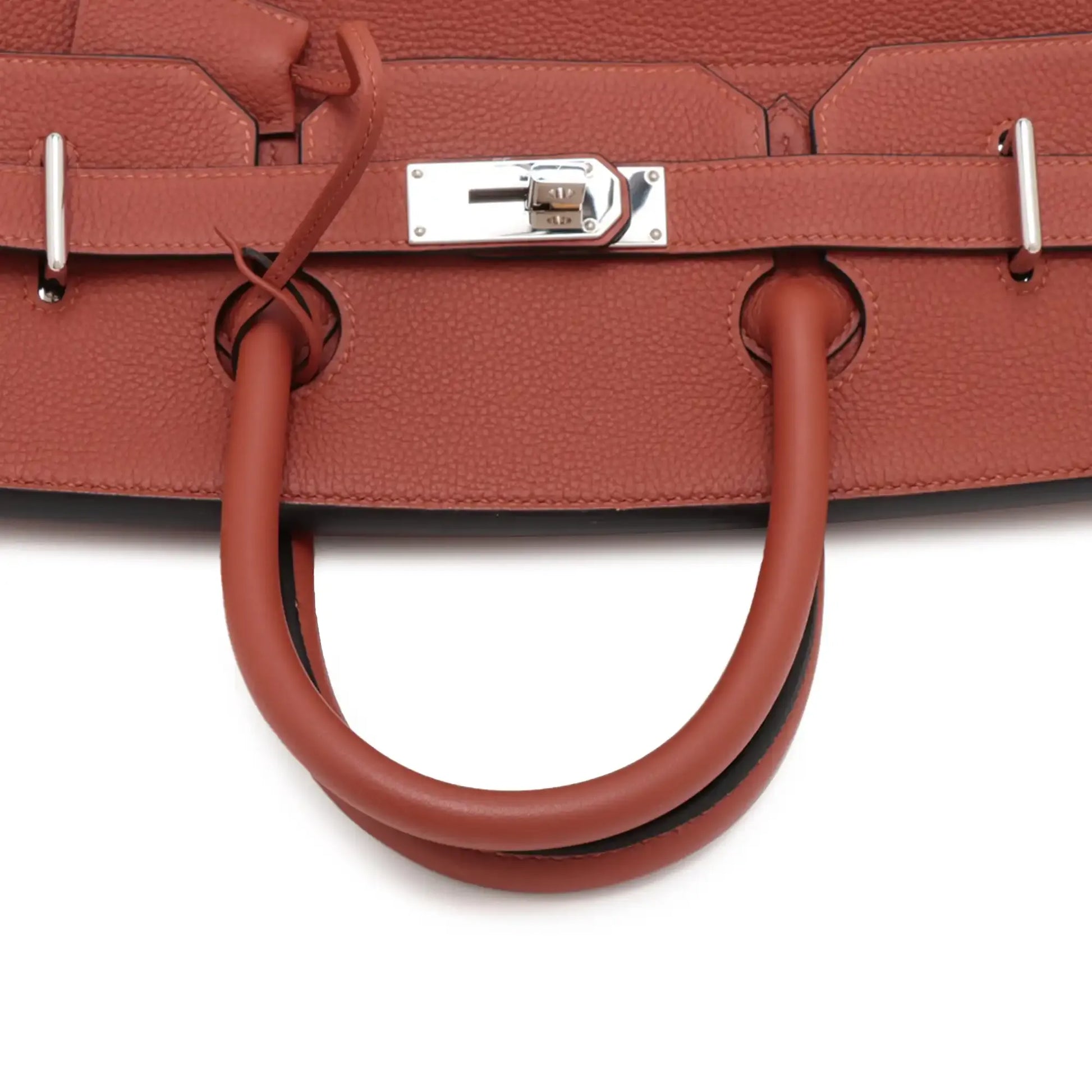 | Description | The Haut A Courroies 40 features a Togo leather body in Cuivre color, rolled leather handles, a front flap with turn-lock closure, and interior slip and zip pockets. | ||||||||||||